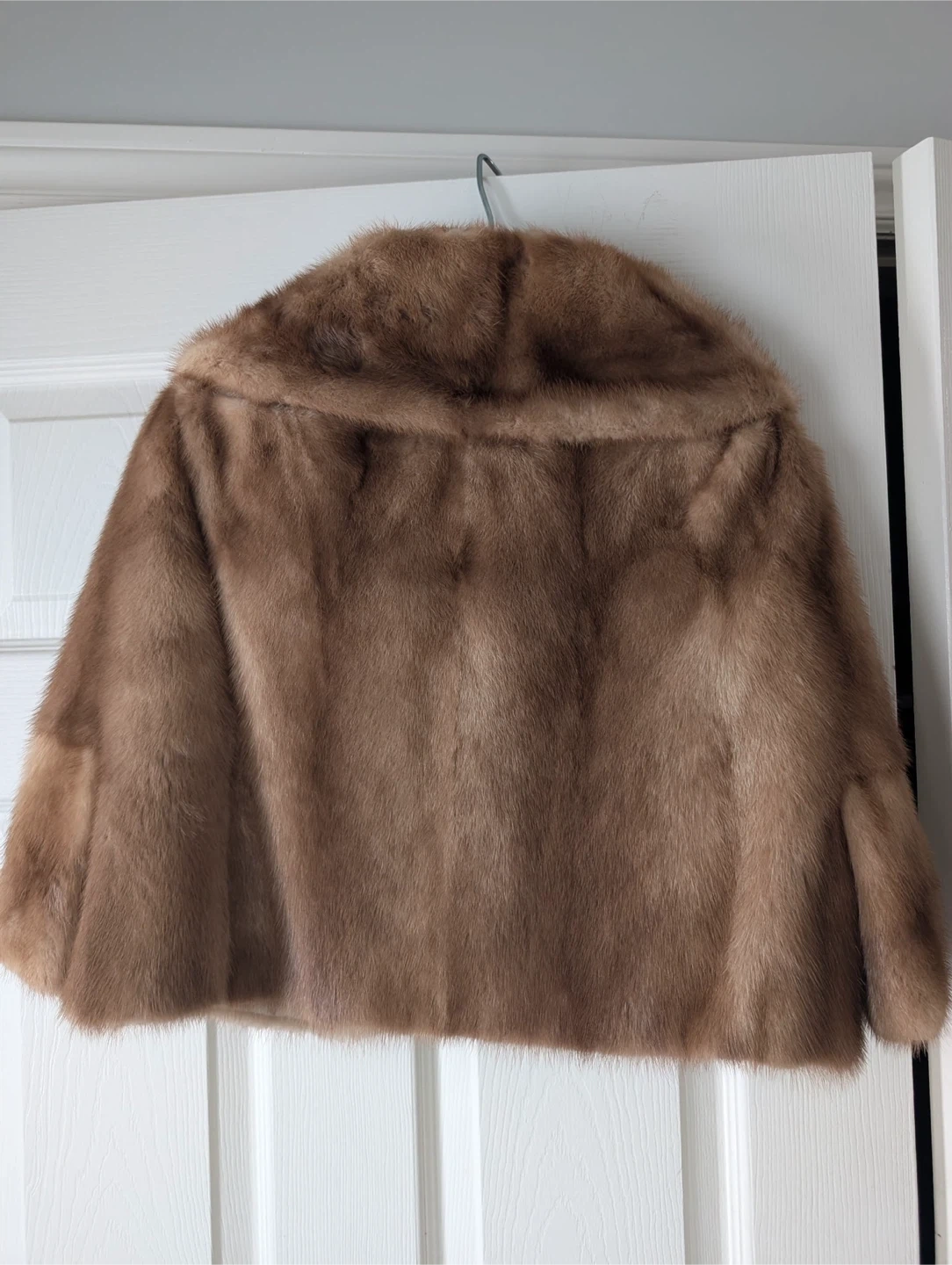 Beautiful mink fur cape. This stylish piece is from Brant Furriers in Brantford, Ont. It's lined with a satin-like fabric featuring a subtle floral pattern.