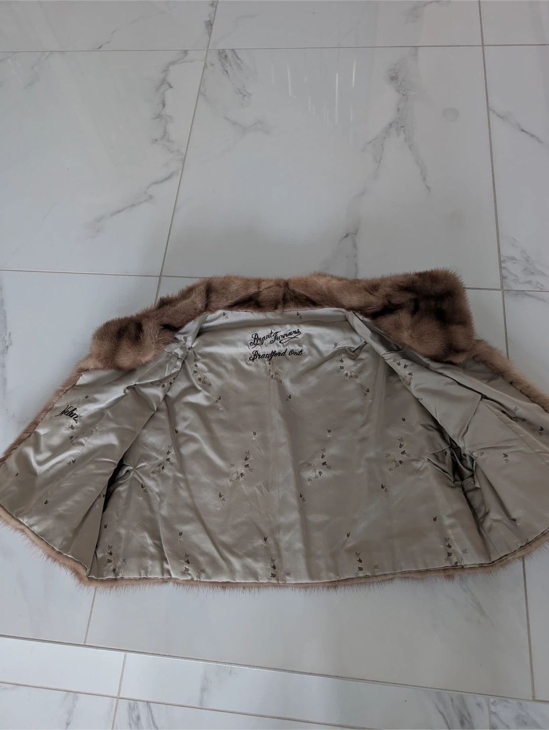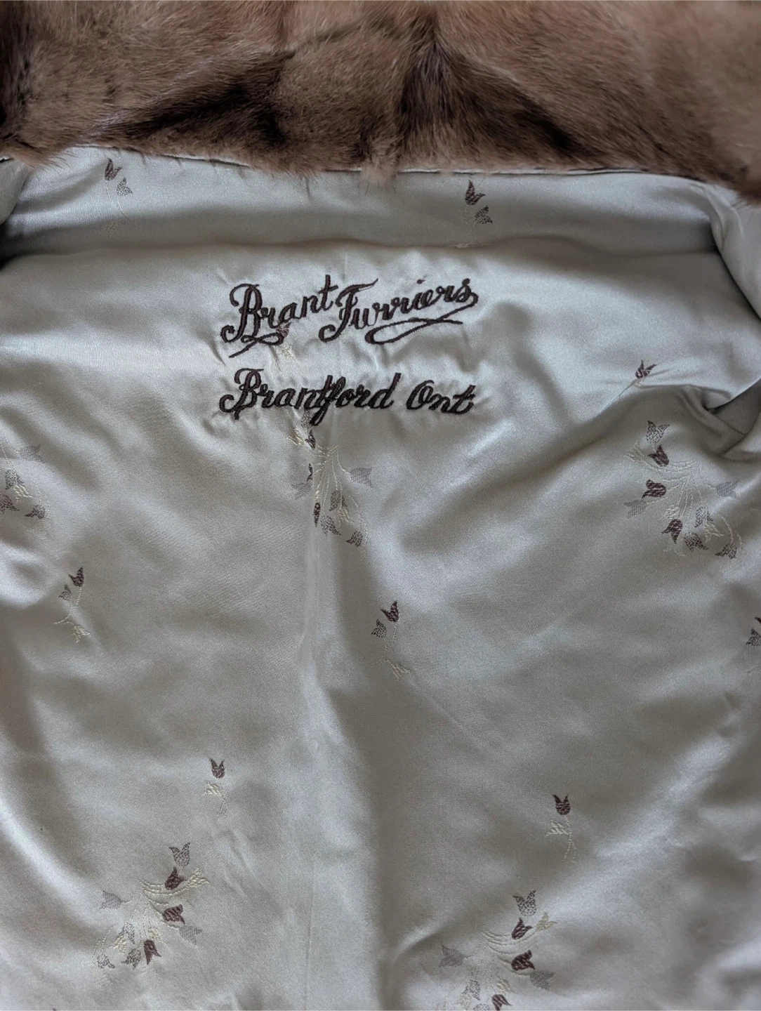 Beautiful mink fur cape. This stylish piece is from Brant Furriers in Brantford, Ont. It's lined with a satin-like fabric featuring a subtle floral pattern.