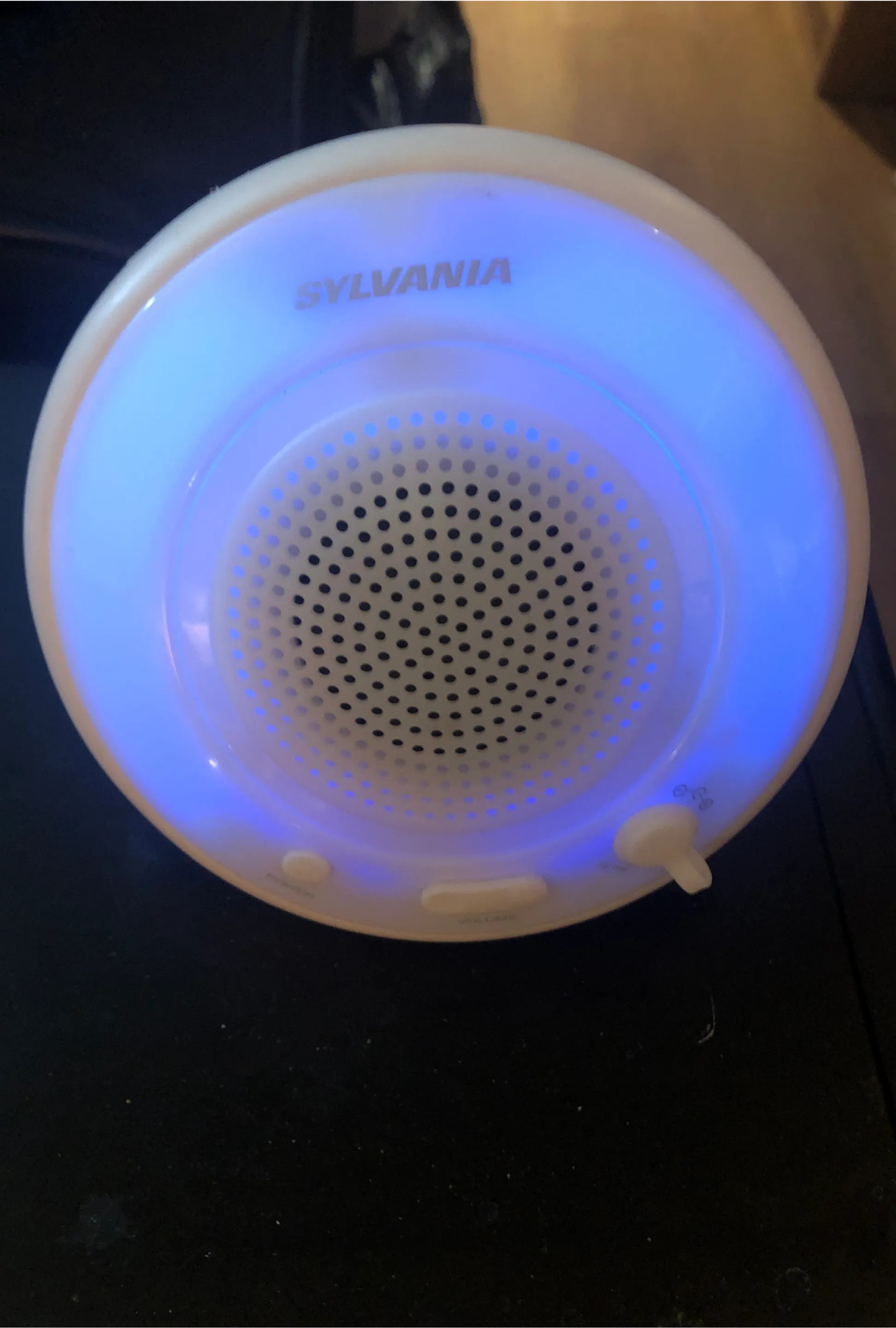 This is a Sylvania portable speaker that also features a coloured light. It has buttons for power and volume. It's great for listening to music anywhere!