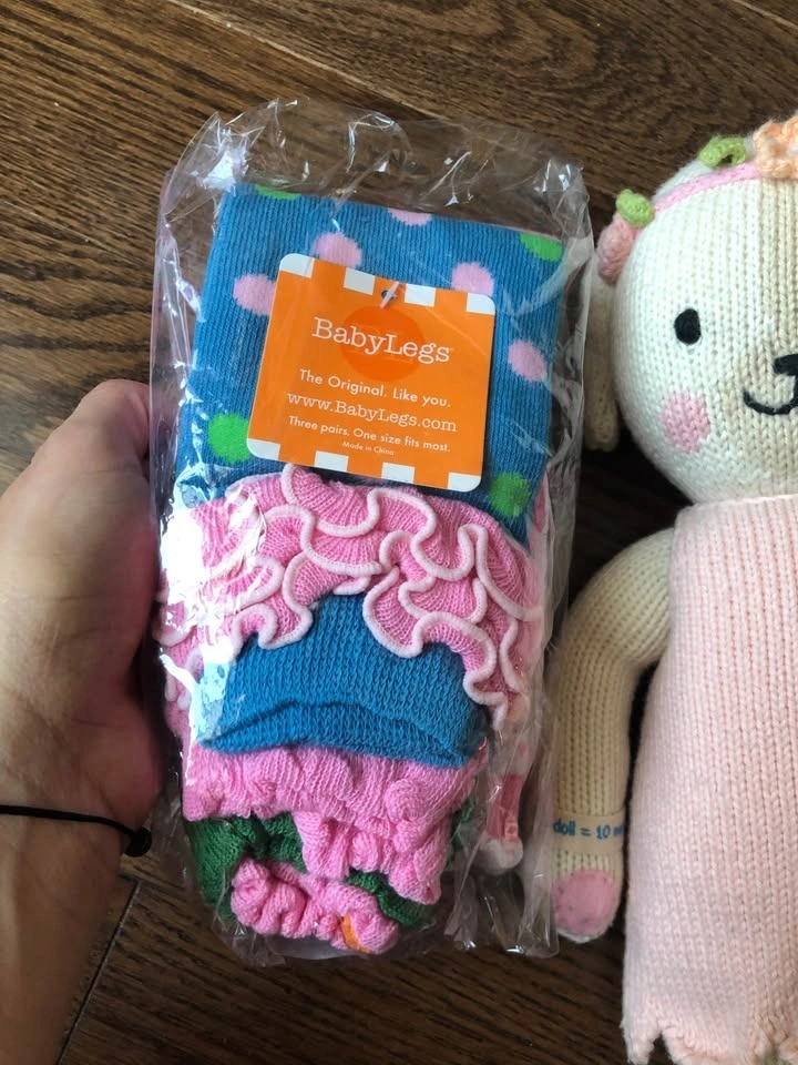 Baby Leggings are considered one size fits most. They measure approximately 3 inches by 12 inches and will fit infants to toddlers 9 to 35 lbs. From a clean, smoke and pet free home. Please check my other ads. Price is final.
