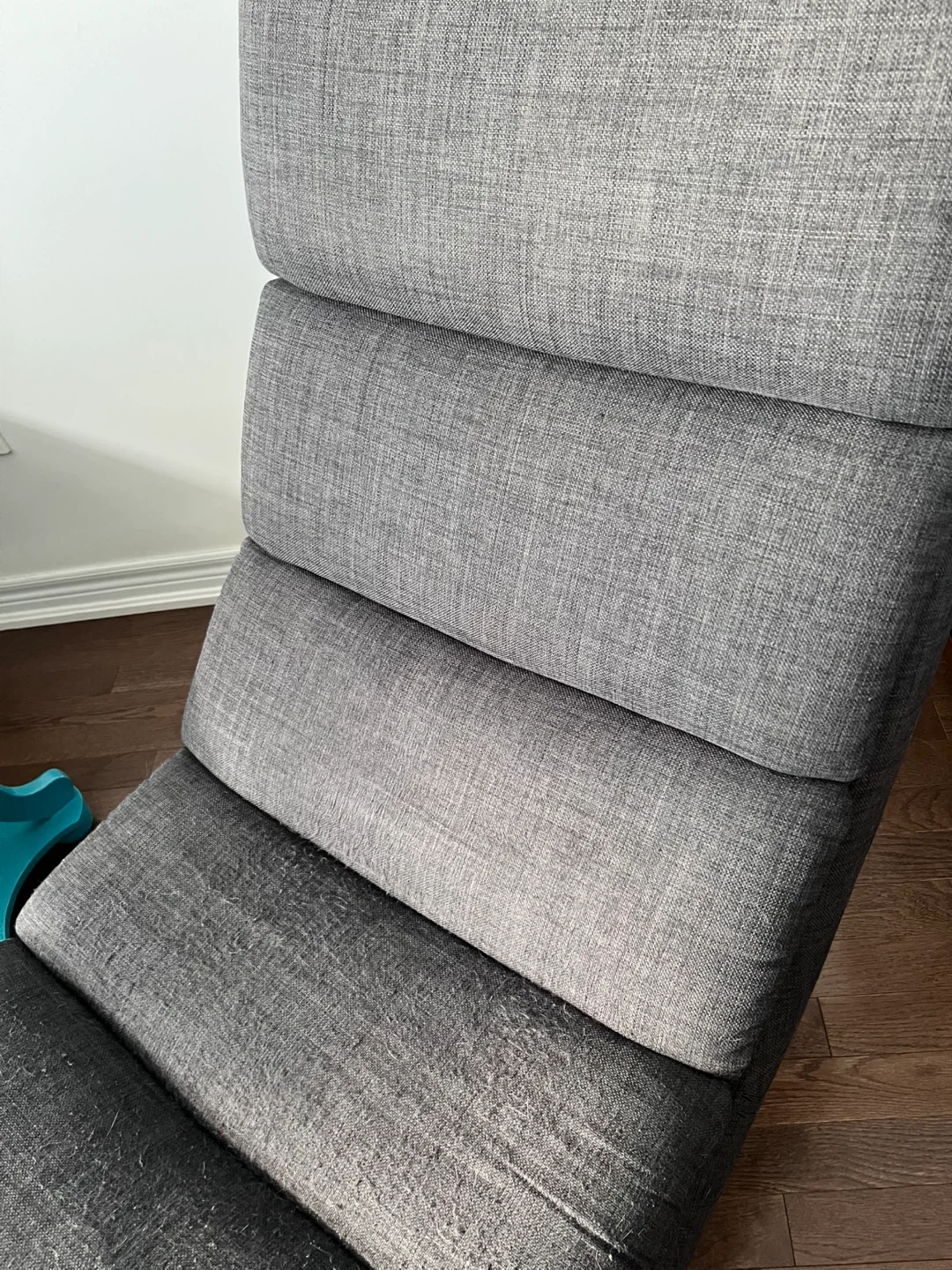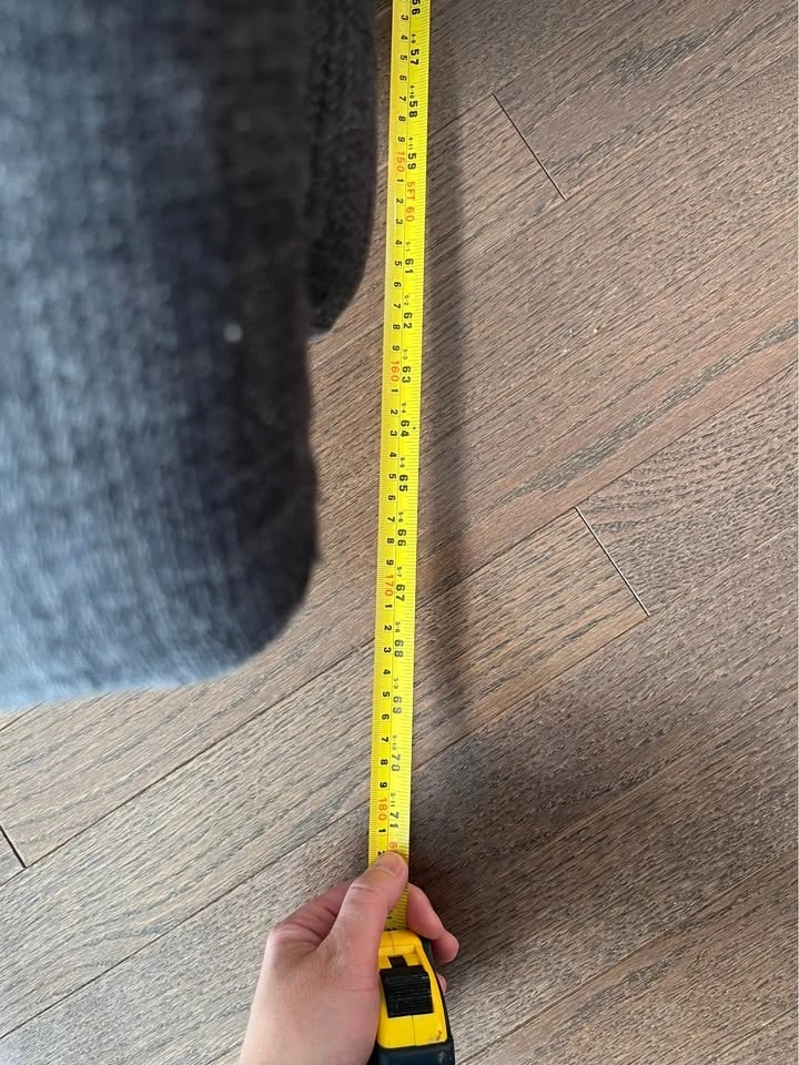 Structube chaise lounge chair with dark gray fabric and a metal base. Very comfortable. Approximately 37in height and 68in length.