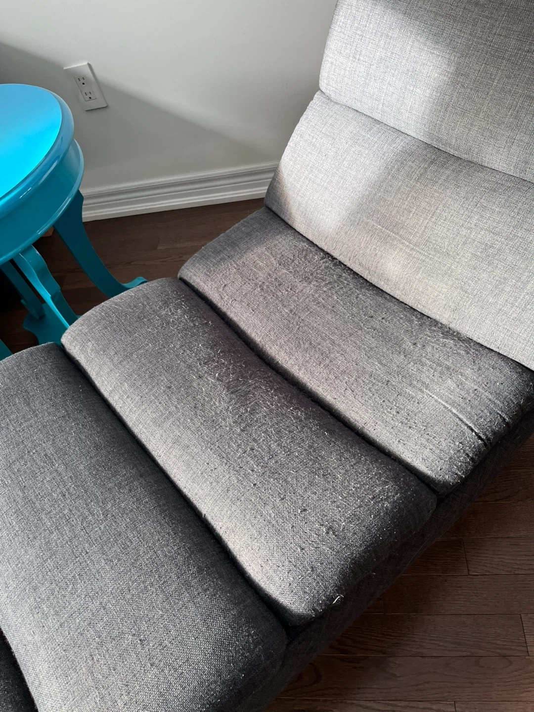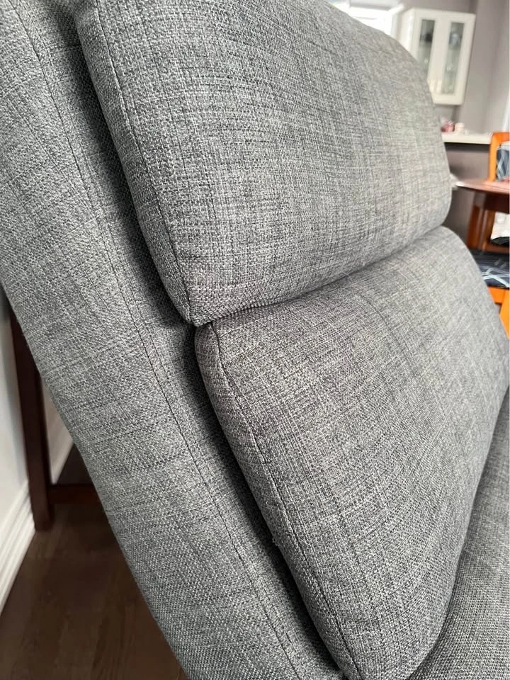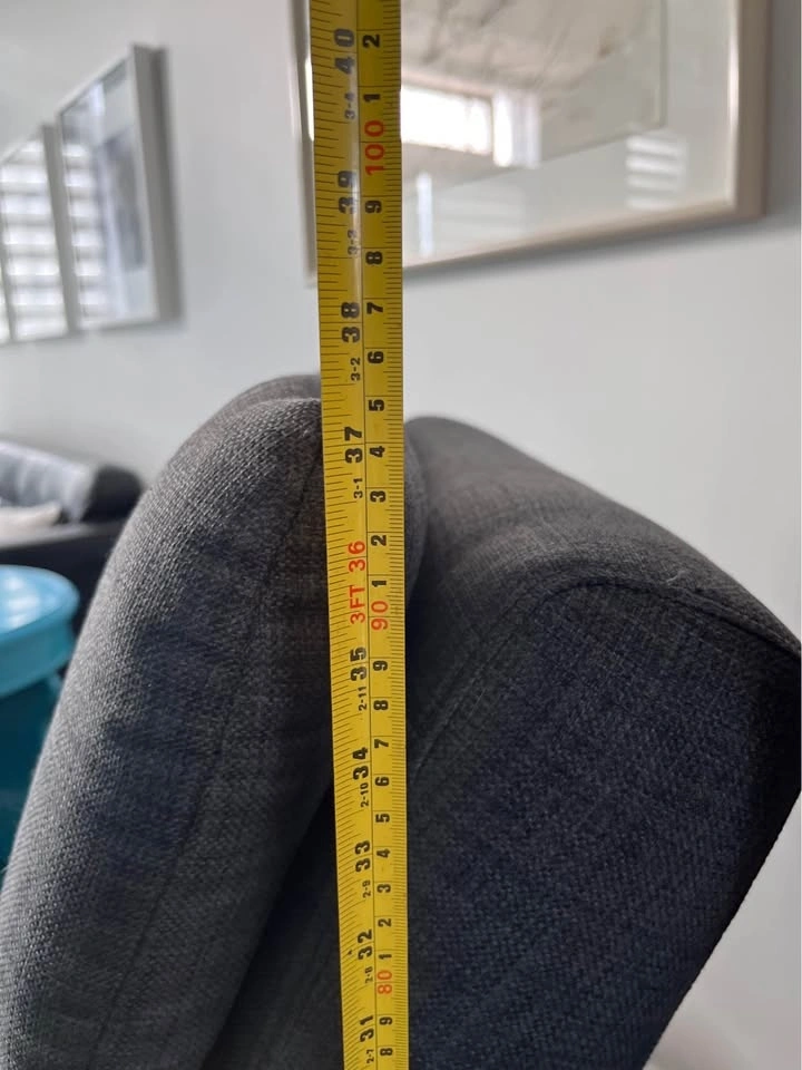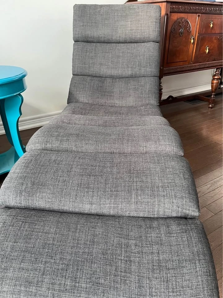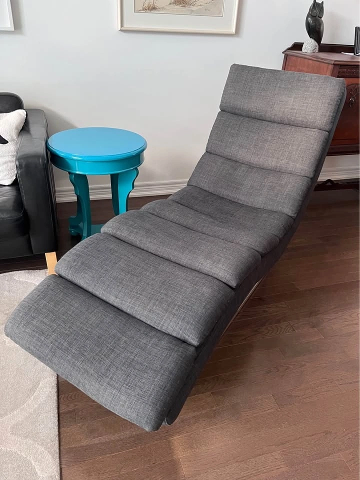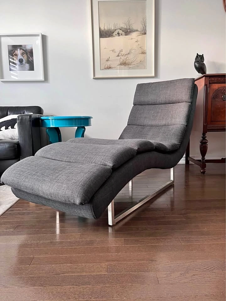 Structube chaise lounge chair with dark gray fabric and a metal base. Very comfortable. Approximately 37in height and 68in length.