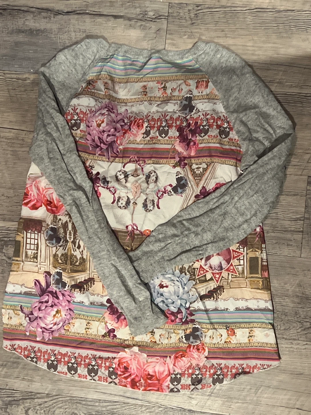 This colourful sweater features a collage of floral designs, historical motifs, and playful patterns. It has grey sleeves and a patterned body, perfect for adding a unique flair to any outfit. The fabric composition appears to be a blend, offering comfort and style.