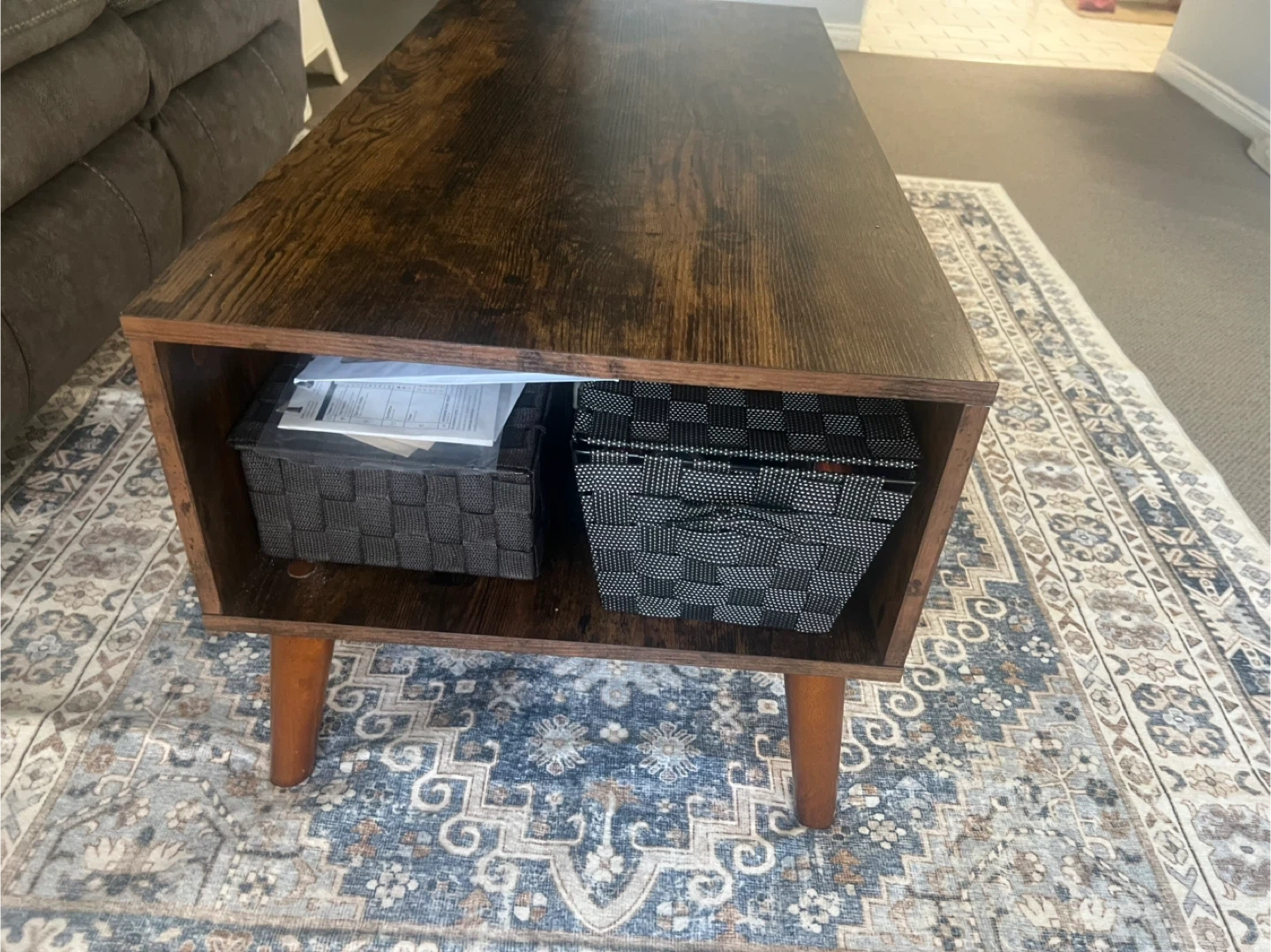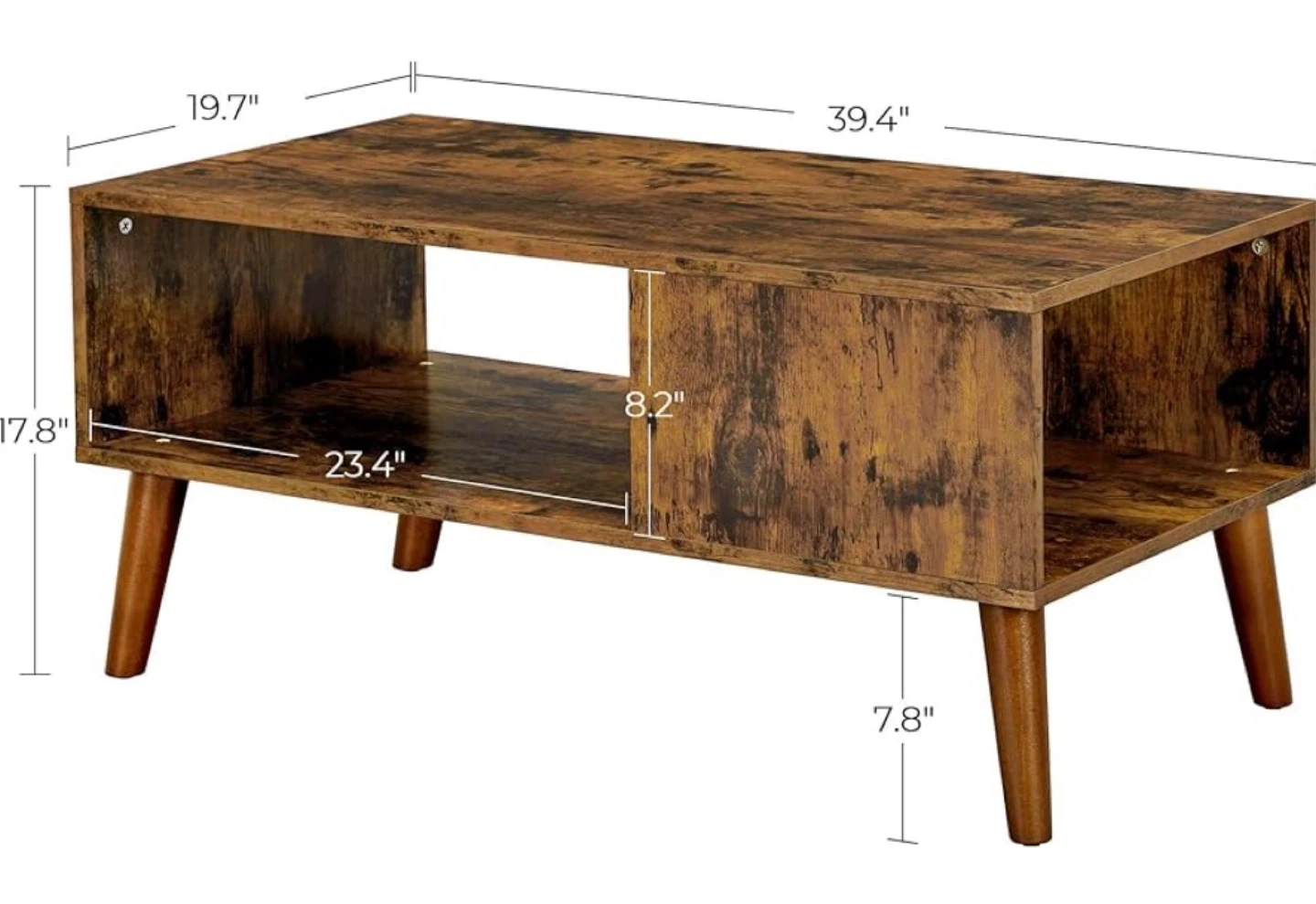 This coffee table has a dark, rustic wood finish and built-in storage compartments. Its dimensions are 39.4" long by 19.7" wide and 17.8" high. It's perfect for storing books, magazines, or decorative items.