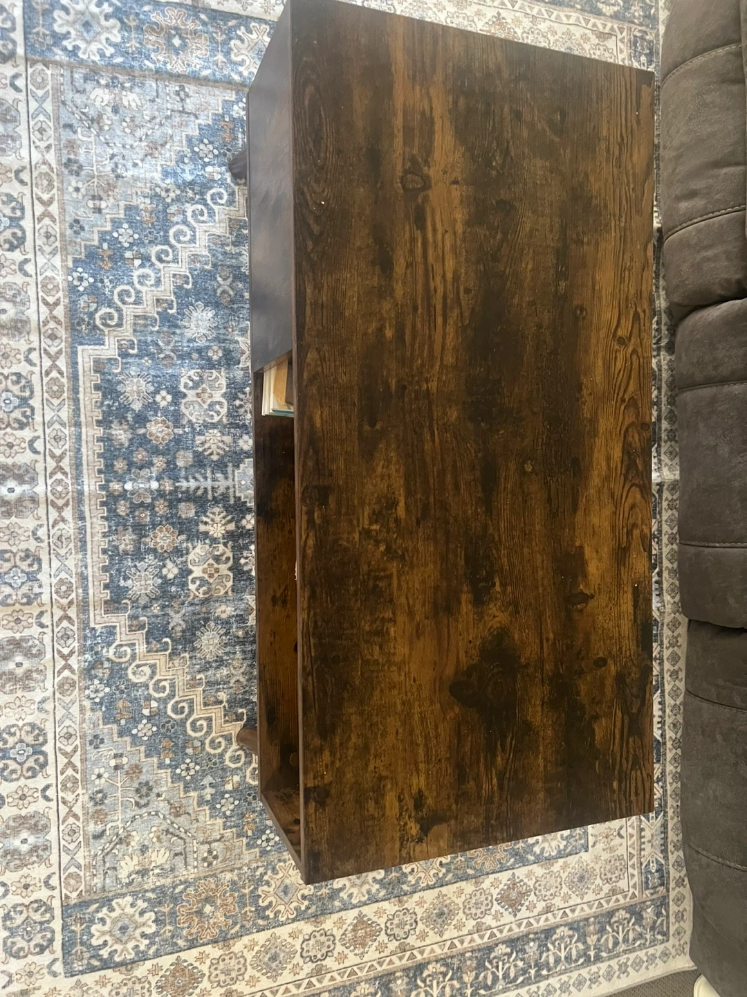 This coffee table has a dark, rustic wood finish and built-in storage compartments. Its dimensions are 39.4" long by 19.7" wide and 17.8" high. It's perfect for storing books, magazines, or decorative items.