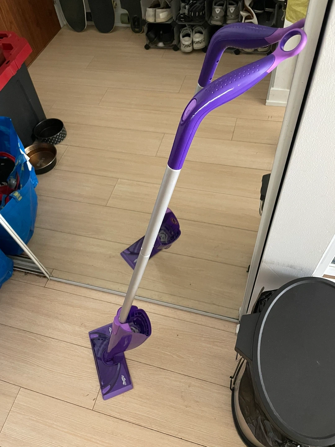 This is a Swiffer WetJet floor cleaner mop. It's purple and has a silver pole. The mop head is also purple and designed to hold cleaning solution.