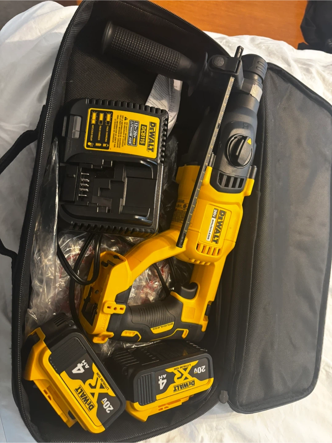 This is a DEWALT 20V MAX cordless rotary hammer kit. It includes the rotary hammer, two 20V 4Ah lithium-ion batteries, and a charger. The kit comes in a soft bag with a hard case insert for the hammer and accessories. It's ready for your next job!