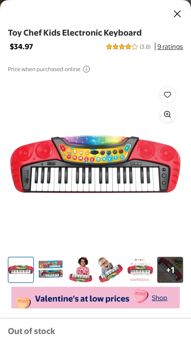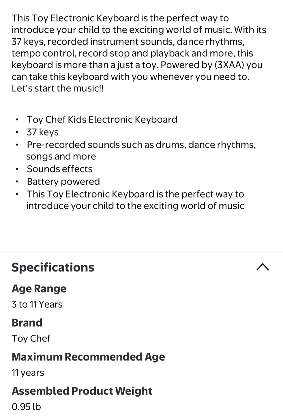 This electronic keyboard is great for introducing kids to music! It's battery powered and features 37 keys. This keyboard has pre-recorded sounds, dance rhythms, and sound effects. It's recommended for ages 3 to 11 years.