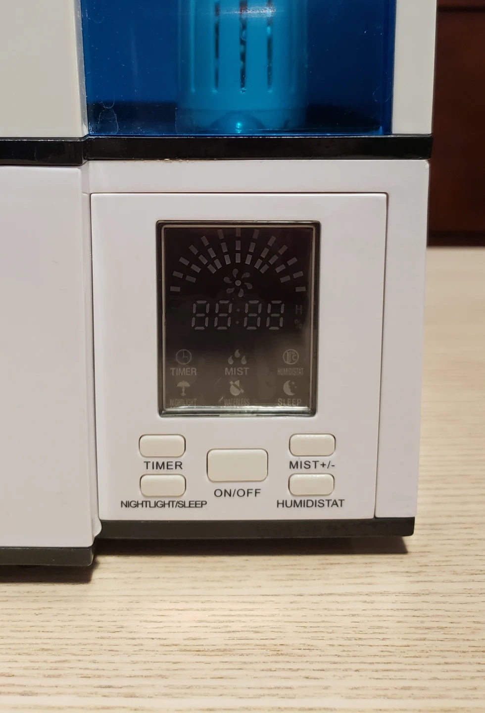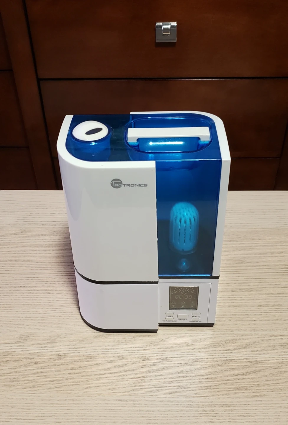 This is a TaoTronics humidifier with a large blue water tank. It has a digital display and several control buttons including timer, mist, and sleep settings. It's designed to add moisture to the air.