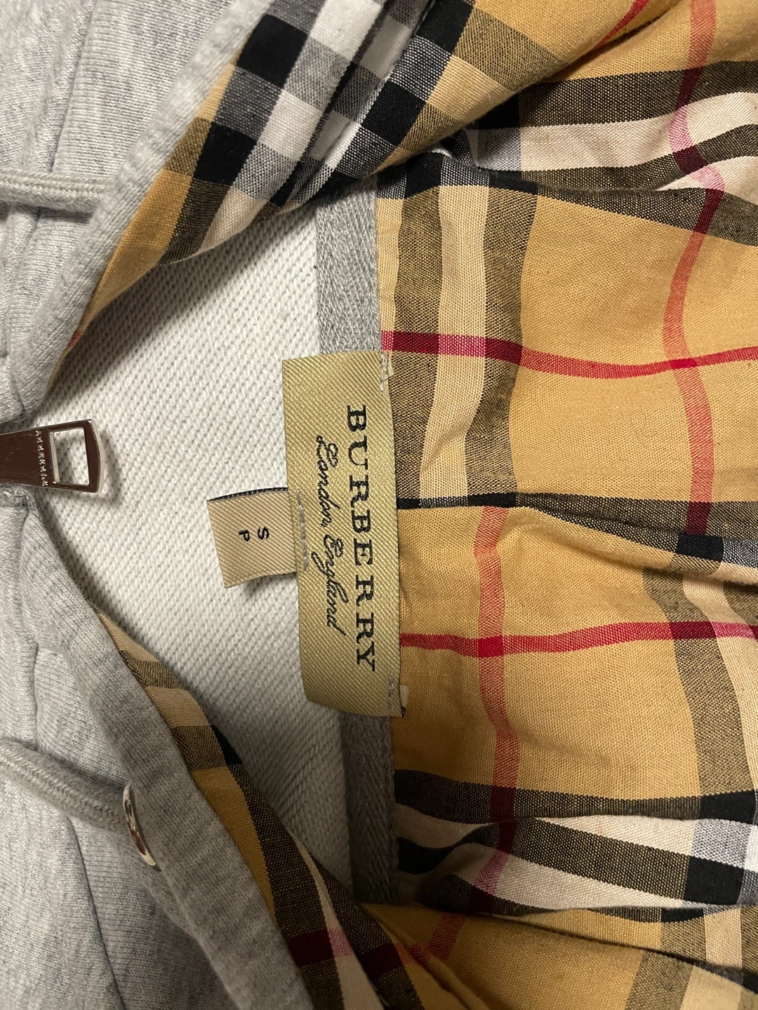 Grey zip-up hoodie from Burberry. It's made of 100% cotton with the signature check lining in the hood. Includes original tags and packaging.