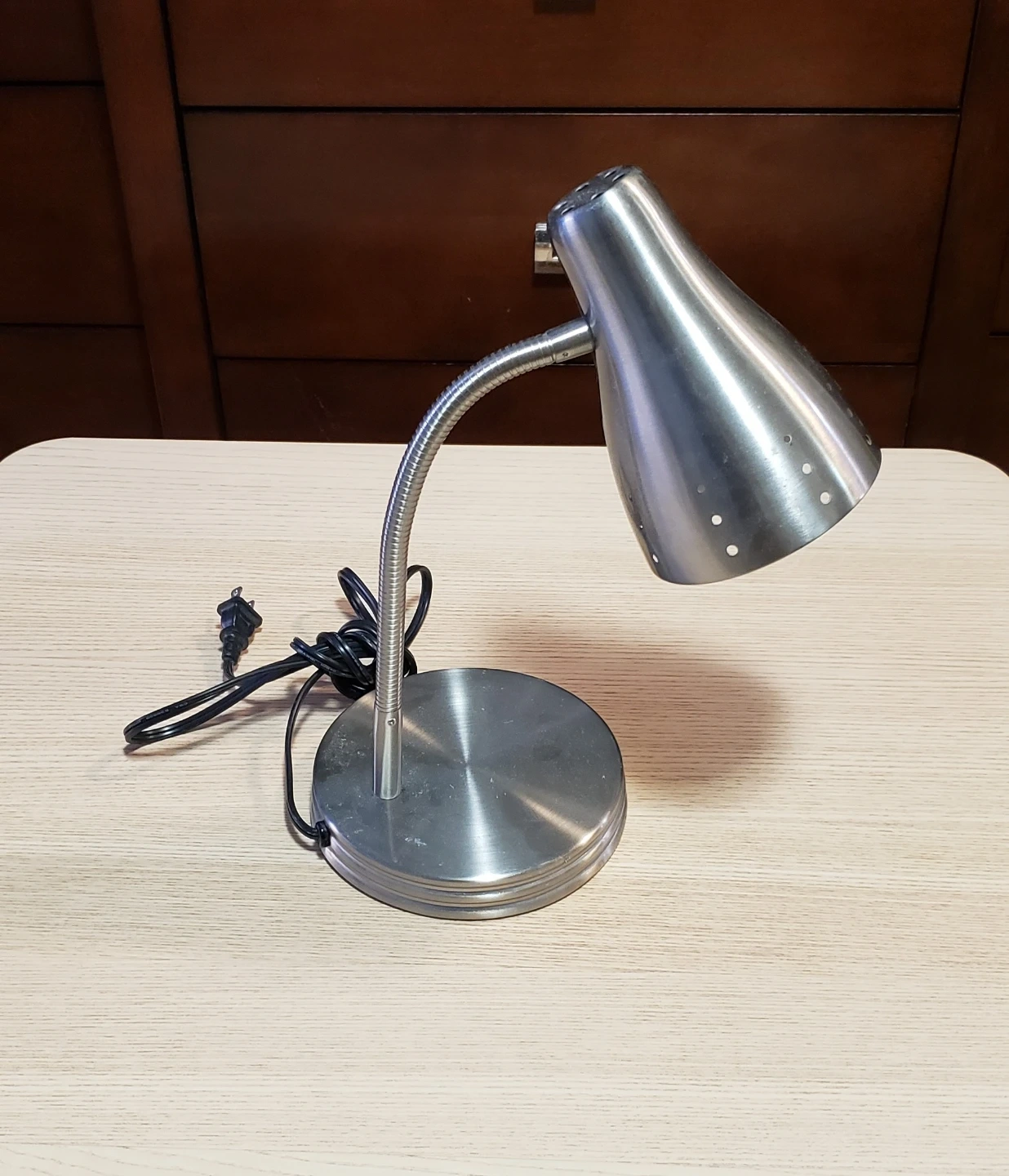 This is a silver gooseneck desk lamp. It has a flexible arm for adjustable lighting. The lamp is made of metal with a brushed finish.