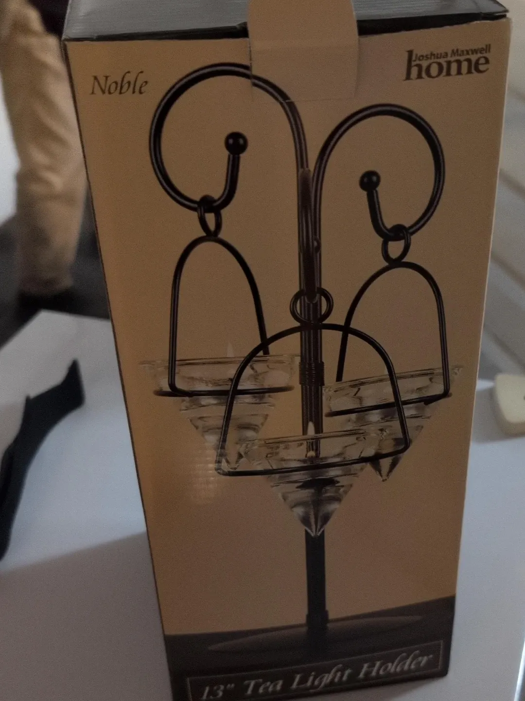 This tea light holder from Joshua Maxwell Home has a Noble design. It's a 13" tea light holder with multiple glass cups.