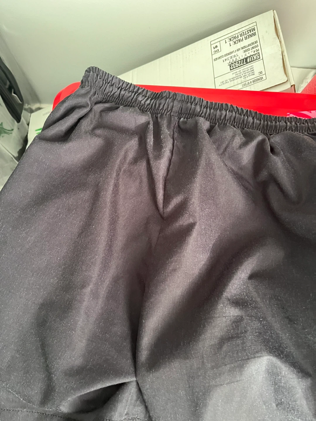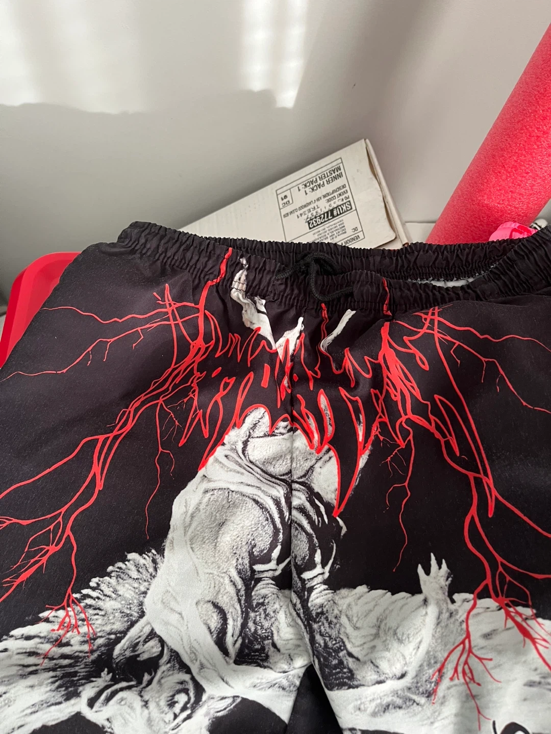 These black shorts feature a striking graphic print with a tiger and red lightning bolt design. They have an elastic waistband with a drawstring for a comfortable fit. Material is lightweight, perfect for casual wear.