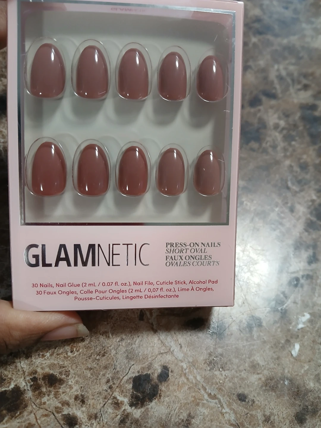 This is a set of Glamnetic short oval press-on nails. It includes 30 nails, nail glue, a nail file, a cuticle stick, and an alcohol pad. These nails offer a quick and easy way to achieve a polished look at home. Price is firm plz. Pick it up midland and Danforth or 401 bay street