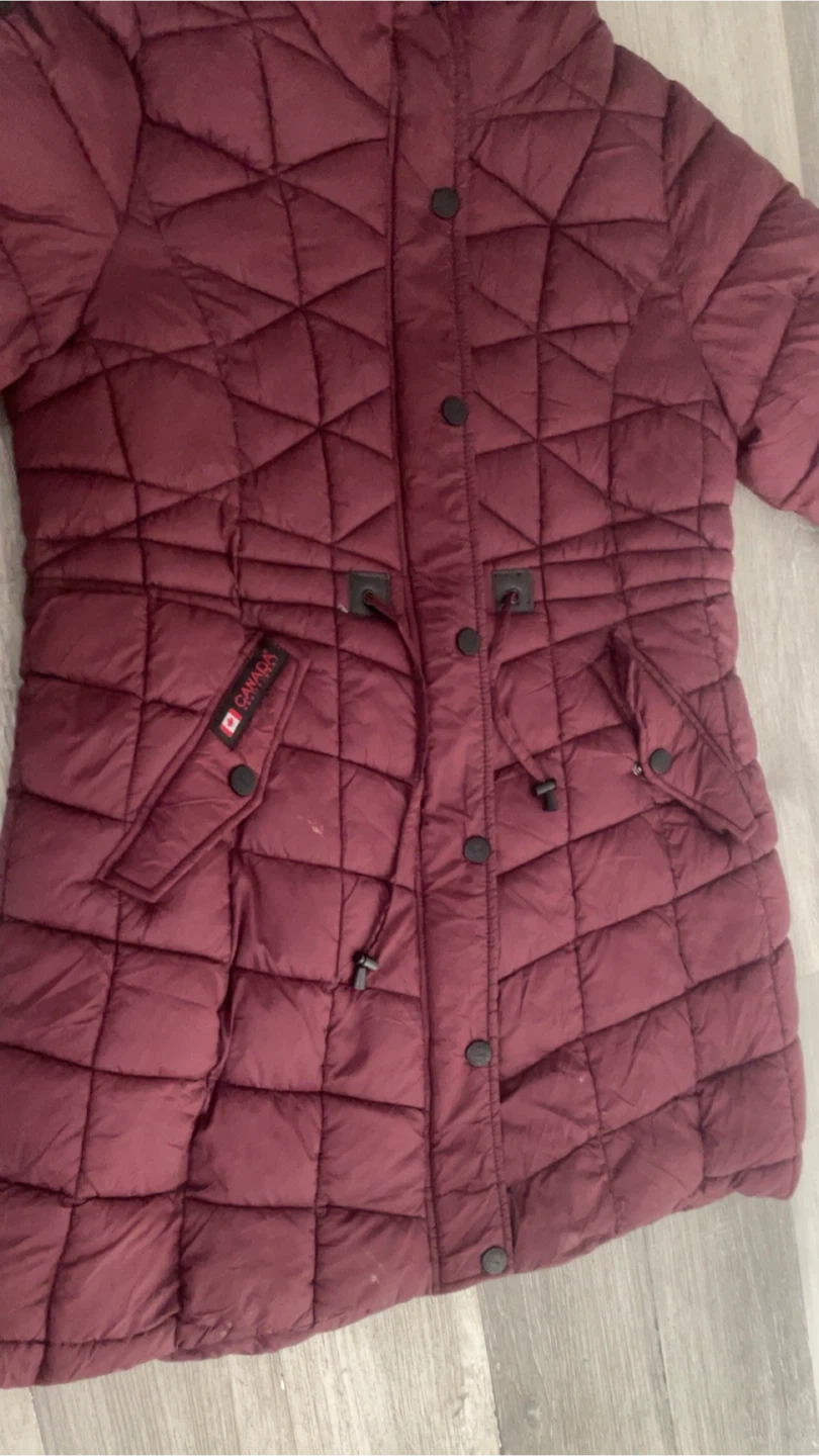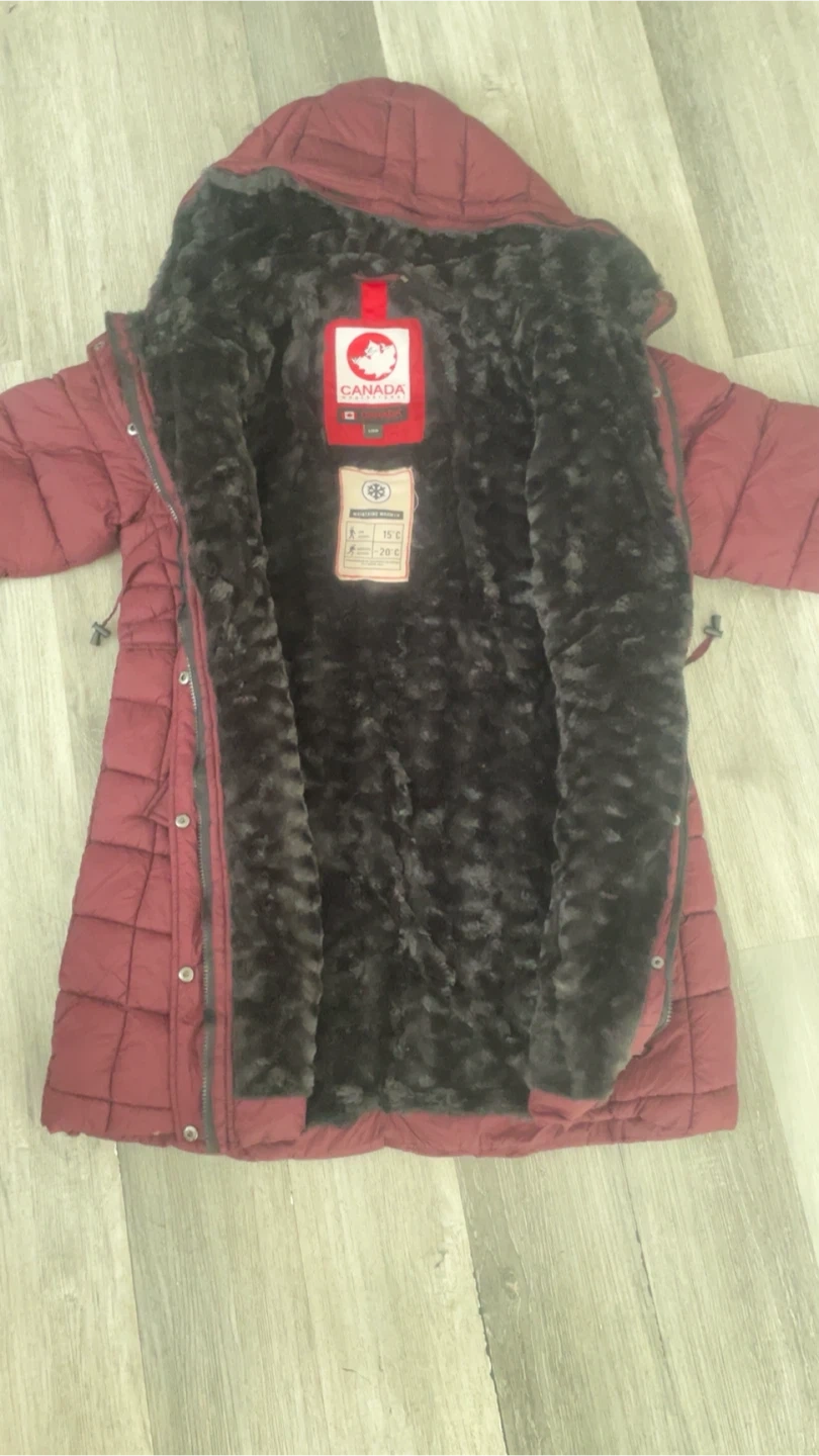 Warm Canada Weather Gear puffer coat in a lovely burgundy colour. It's lined with soft faux fur for extra warmth and comfort. Recommended for temperatures between 15°C (low activity) and -20°C (moderate activity).