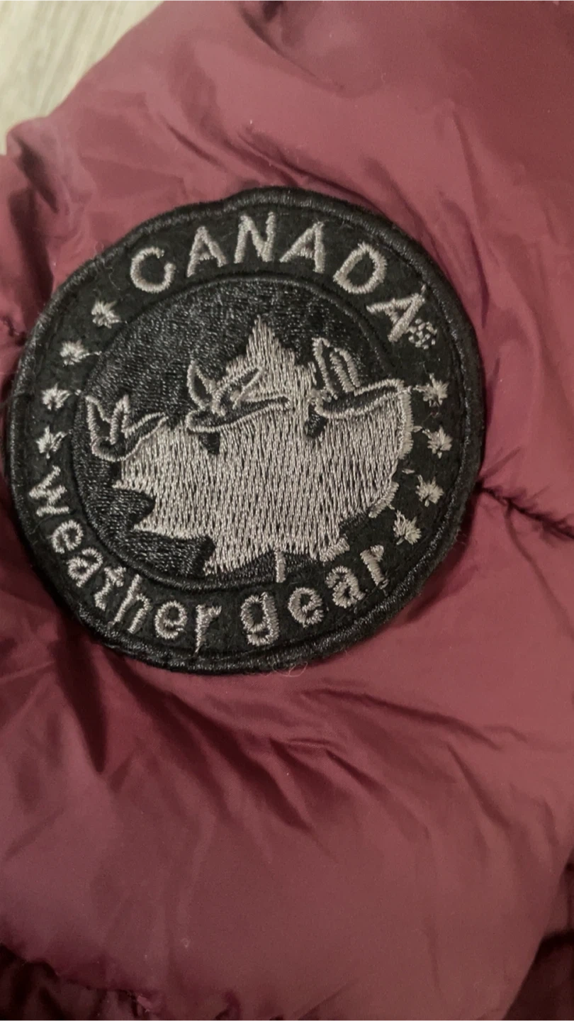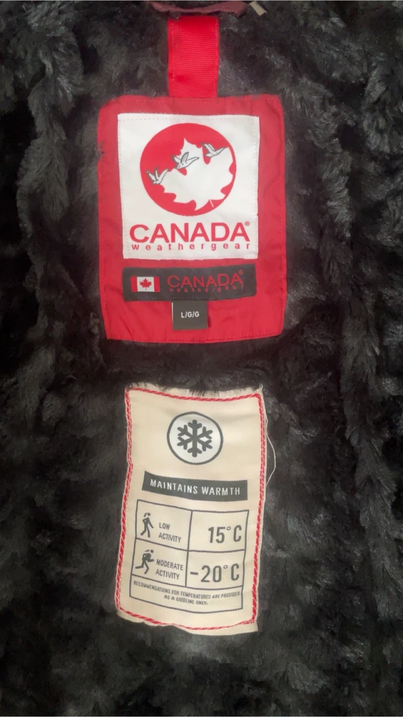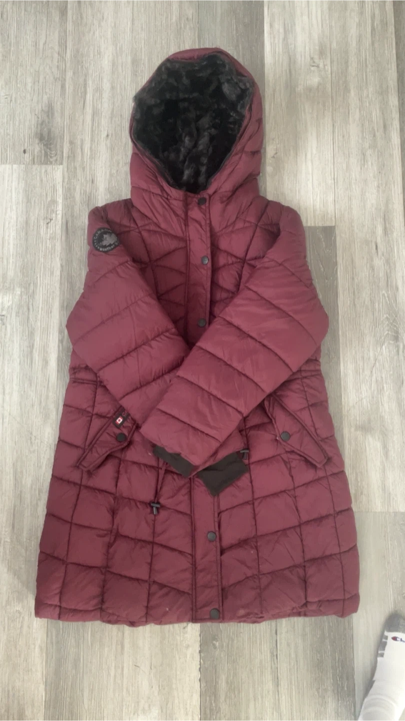 Warm Canada Weather Gear puffer coat in a lovely burgundy colour. It's lined with soft faux fur for extra warmth and comfort. Recommended for temperatures between 15°C (low activity) and -20°C (moderate activity).