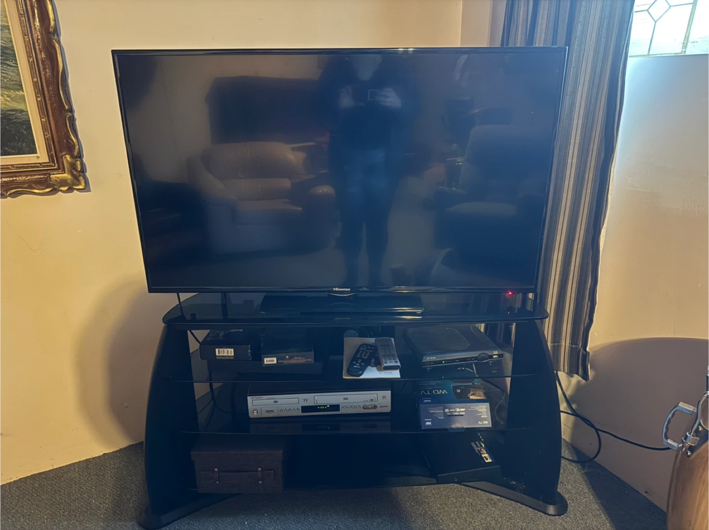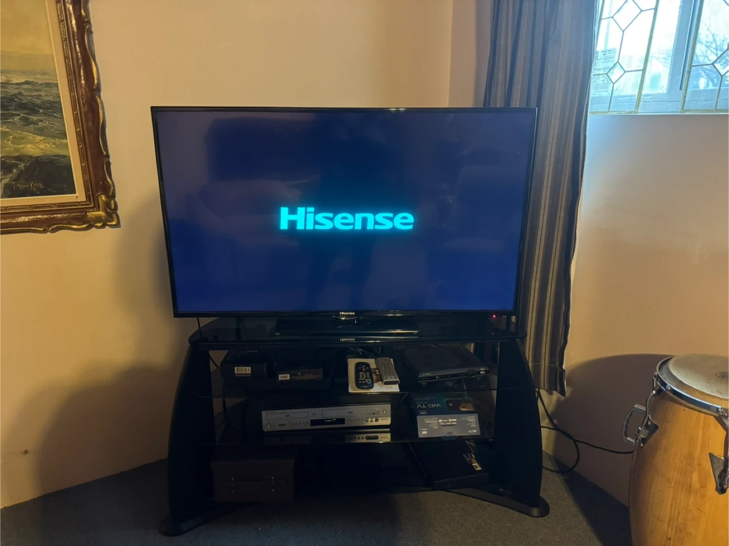 Hisense flat screen television. It's a black 50-inch TV, perfect for a living room or den. Includes a TV stand with multiple shelves for your media components.
