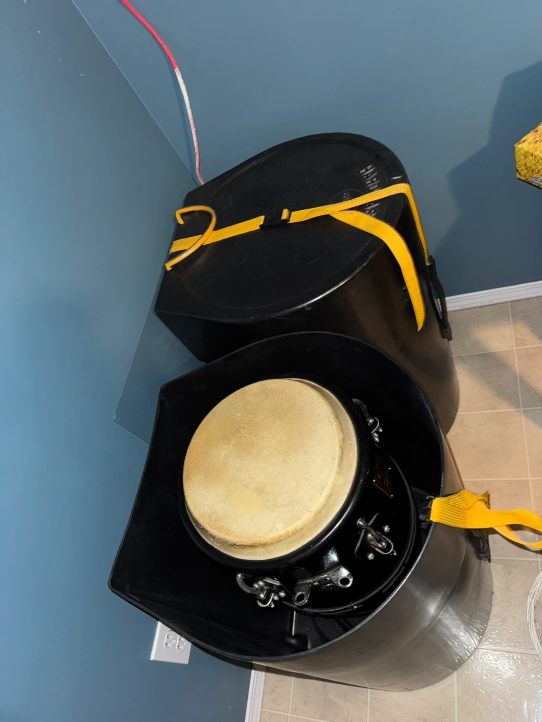 These are 2 black conga drum. They are made with a natural skin head and has adjustable tuning hardware. It comes with a black, hardshell case that has yellow straps for securing the drum. The case is designed to protect the instrument during transport or storage.