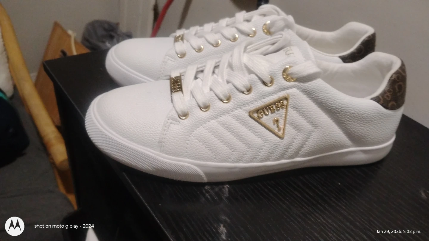 These Guess sneakers are a crisp white colour with gold accents. They feature a textured exterior and the signature Guess triangle logo on the side. The sole is white and the interior has a brown and gold patterned lining. Size is 9 women