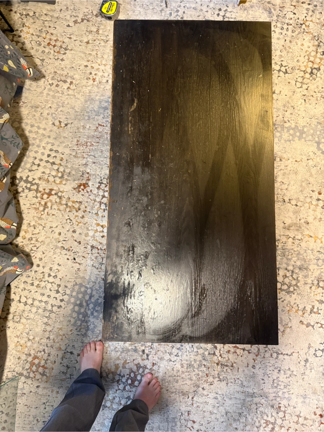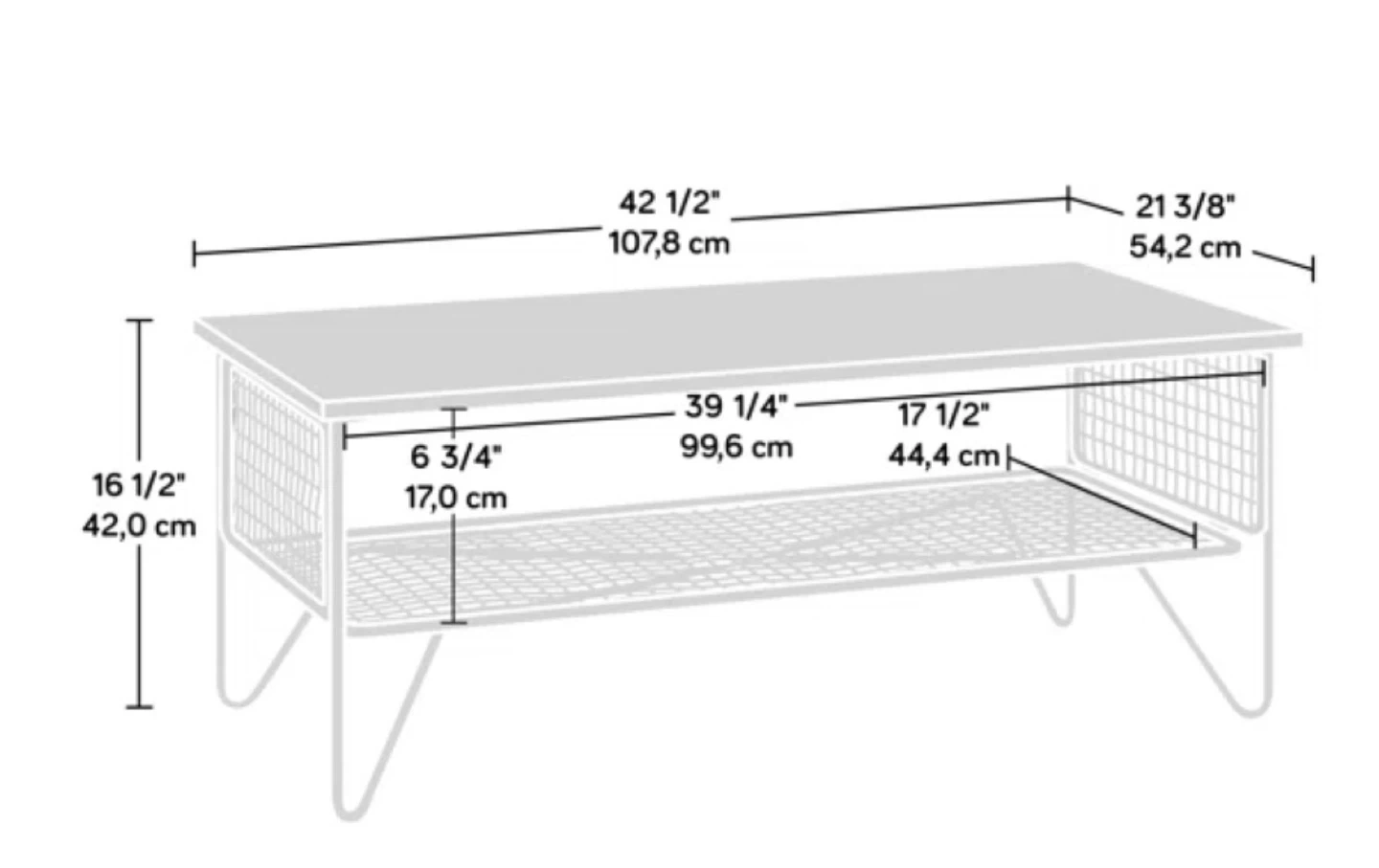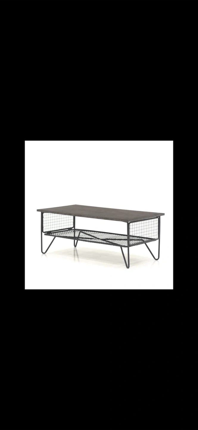 Industrial style coffee table featuring a wire mesh shelf for storage. This table's dimensions are 42 1/2" (107.8 cm) long, 21 3/8" (54.2 cm) wide, and 16 1/2" (42.0 cm) high. The shelf measures 39 1/4" (99.6 cm) by 17 1/2" (44.4 cm) and is 6 3/4" (17.0 cm) from the floor. It's a functional piece for any living area. Come get it before i put it in the alley on Monday