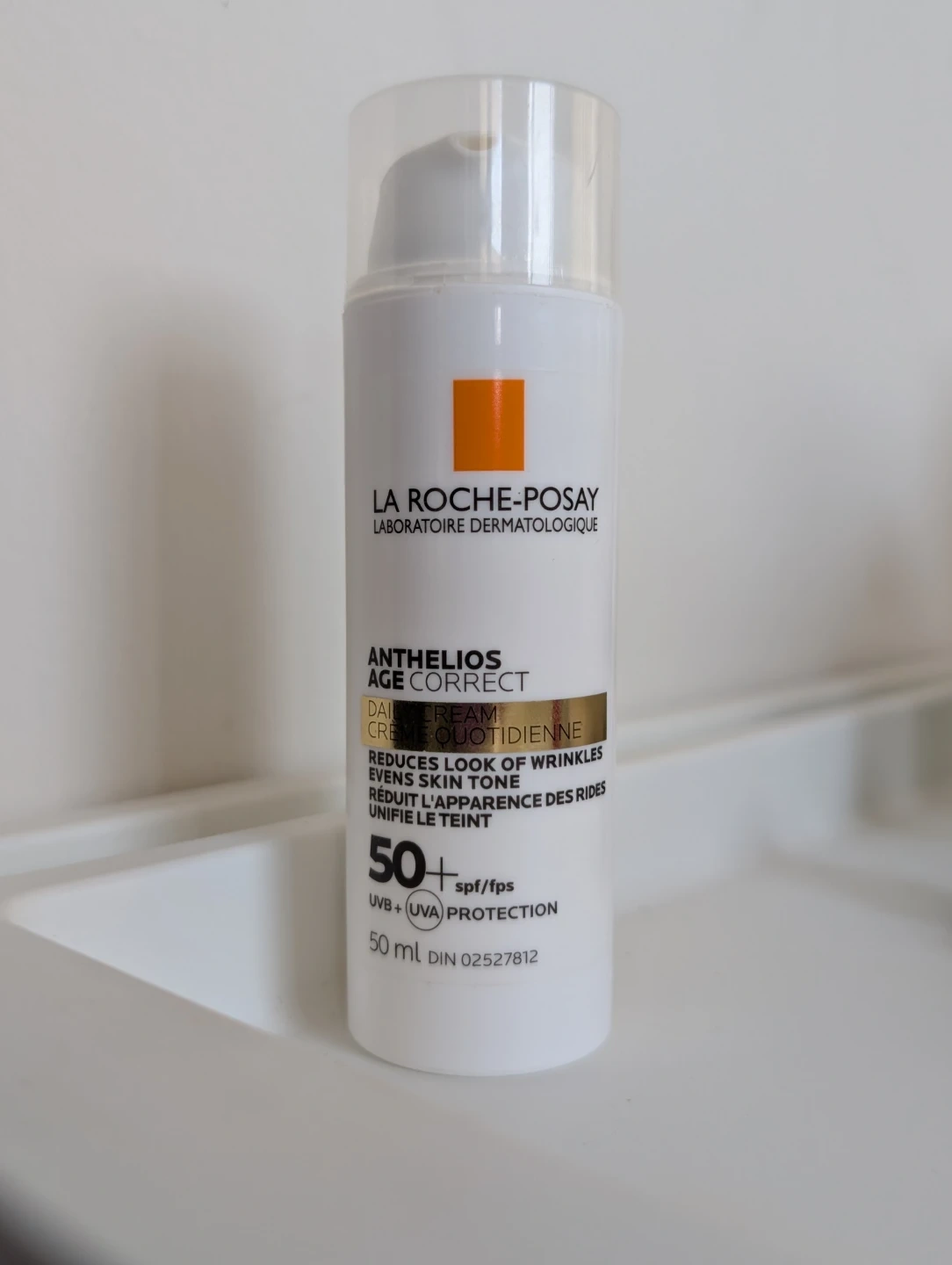 La Roche-Posay Anthelios Age Correct Daily Cream. Daily cream with SPF 50+ for UVA/UVB protection. Reduces the look of wrinkles and evens skin tone. 50 ml size.