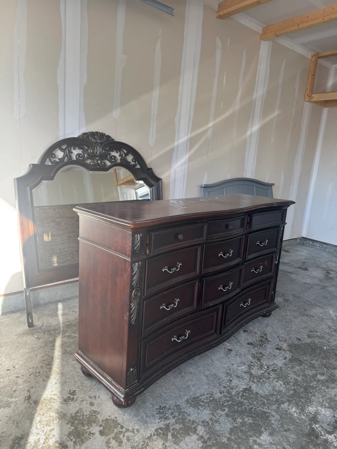 Classic dark wood dresser with a decorative mirror. It features multiple drawers for storage. Made of solid wood with ornate detailing. Great for a bedroom set!