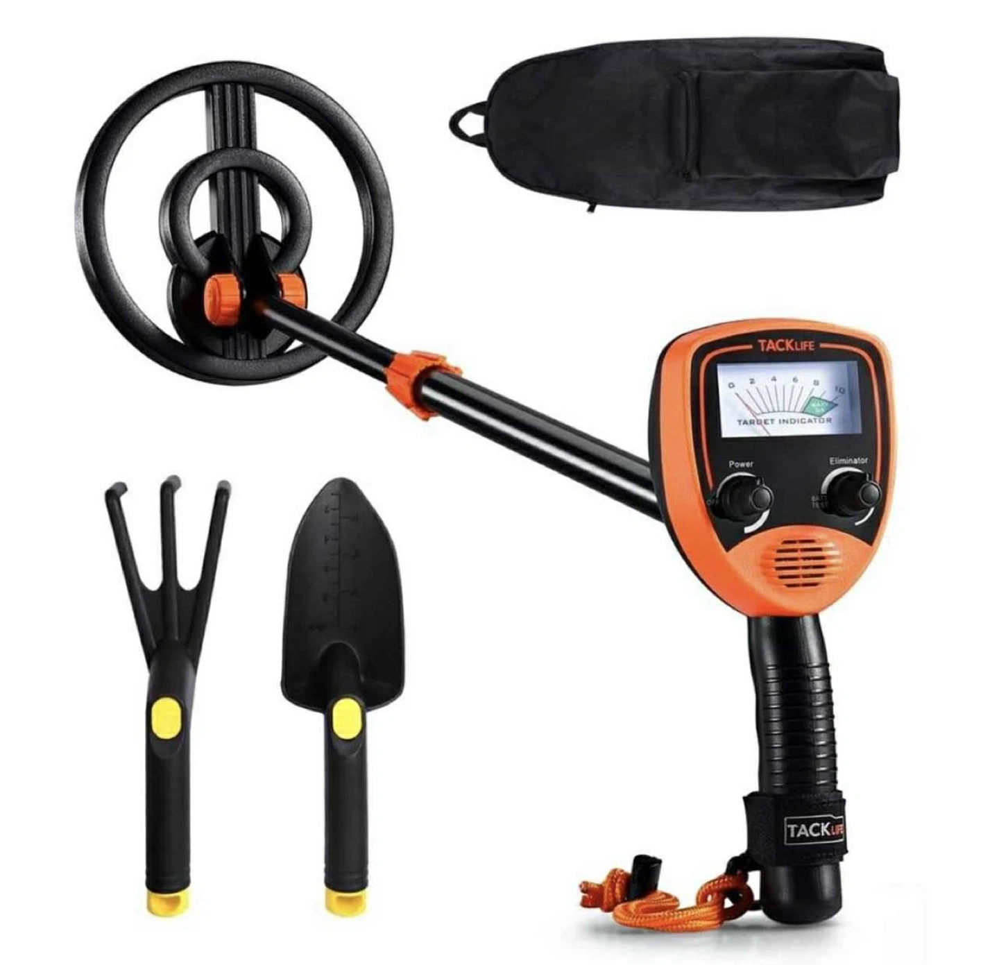 WHAT YOU CAN GET: 1 TACKLIFE Metal Detector MMD06, 2 9V Batteries, 1 Shovel, 1 Rake, 1 Carrying Bag, 1 User Manual