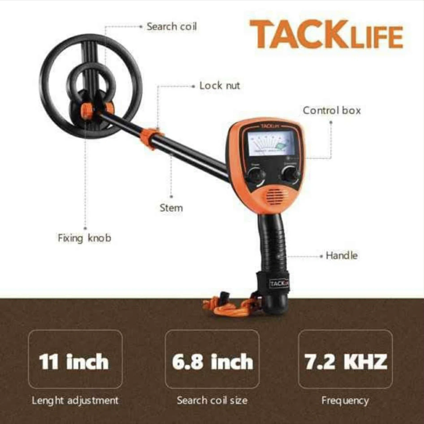 WHAT YOU CAN GET: 1 TACKLIFE Metal Detector MMD06, 2 9V Batteries, 1 Shovel, 1 Rake, 1 Carrying Bag, 1 User Manual