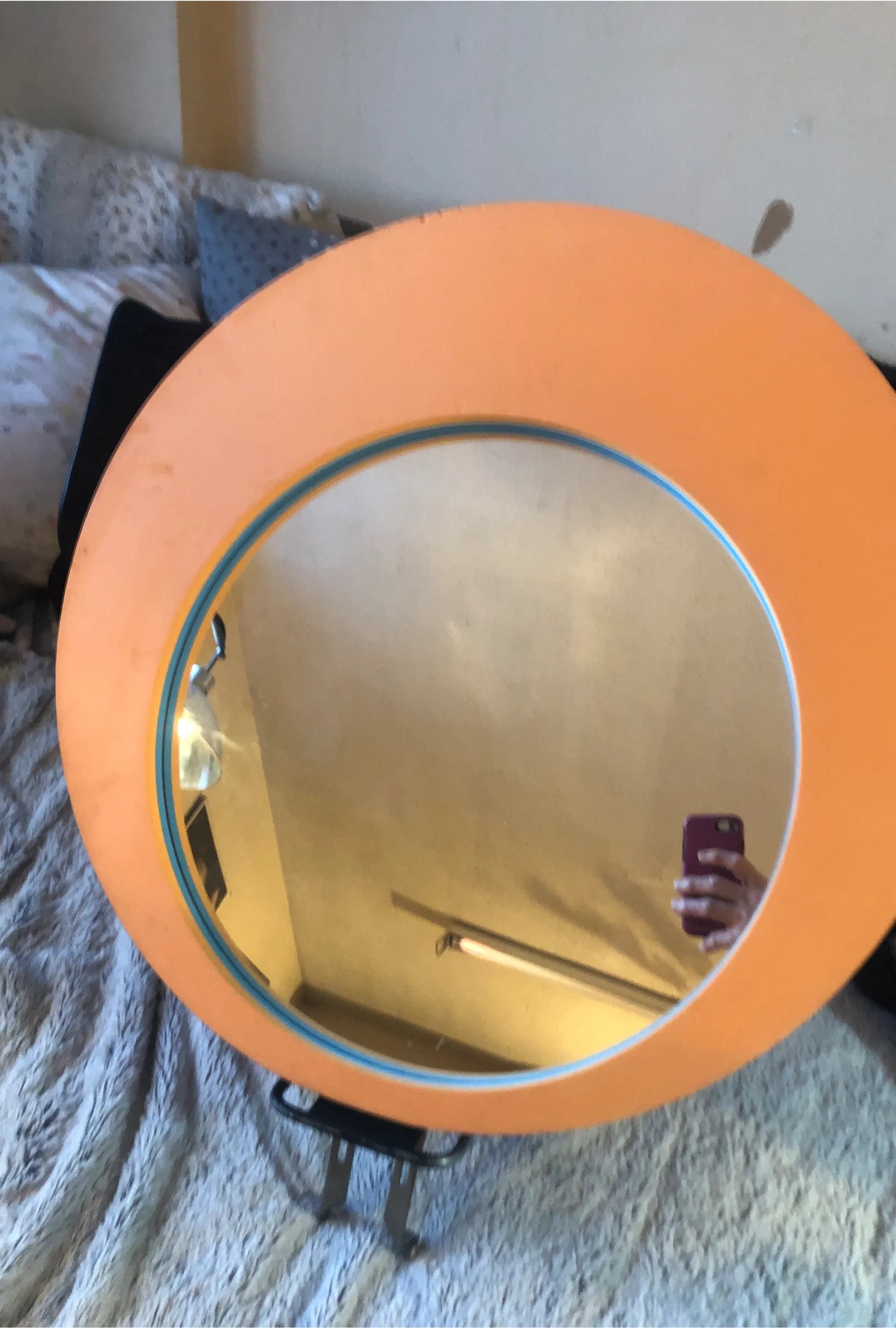 This is an orange oval mirror with a blue trim. It has a stand for easy placement. Great for adding a pop of colour to any room!