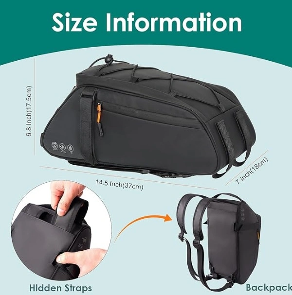 This versatile 10L bike bag can be used as a pannier, backpack, or shoulder bag. Designed for cyclists, commuters, and weekend riders, it offers a waterproof build, spacious compartments, and reflective safety elements. Perfect for carrying essentials while cycling or walking. Key Features: 3-in-1 Design: Rear rack bag, backpack, and handbag. 10L Capacity: Spacious main compartment with mesh inner pockets. Waterproof & Durable: PU material with sealed zippers. Reflective Sides: Improved night visibility. Secure Fit: Velcro straps + elastic bungee cord on top. Hidden Backpack Straps: Converts in seconds.