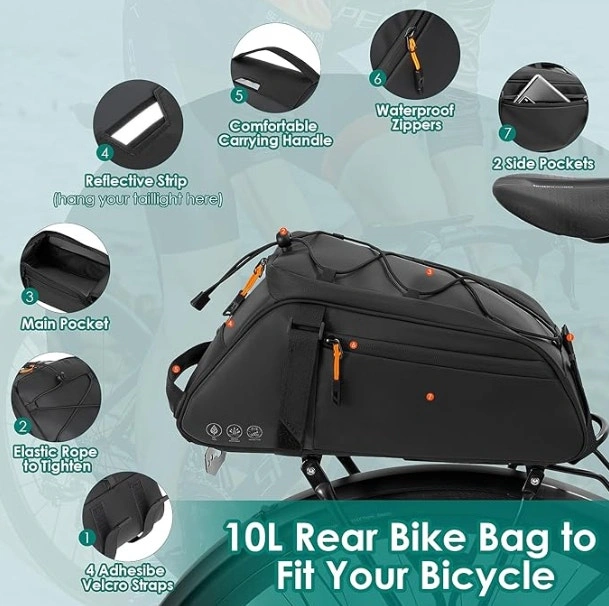This versatile 10L bike bag can be used as a pannier, backpack, or shoulder bag. Designed for cyclists, commuters, and weekend riders, it offers a waterproof build, spacious compartments, and reflective safety elements. Perfect for carrying essentials while cycling or walking. Key Features: 3-in-1 Design: Rear rack bag, backpack, and handbag. 10L Capacity: Spacious main compartment with mesh inner pockets. Waterproof & Durable: PU material with sealed zippers. Reflective Sides: Improved night visibility. Secure Fit: Velcro straps + elastic bungee cord on top. Hidden Backpack Straps: Converts in seconds.