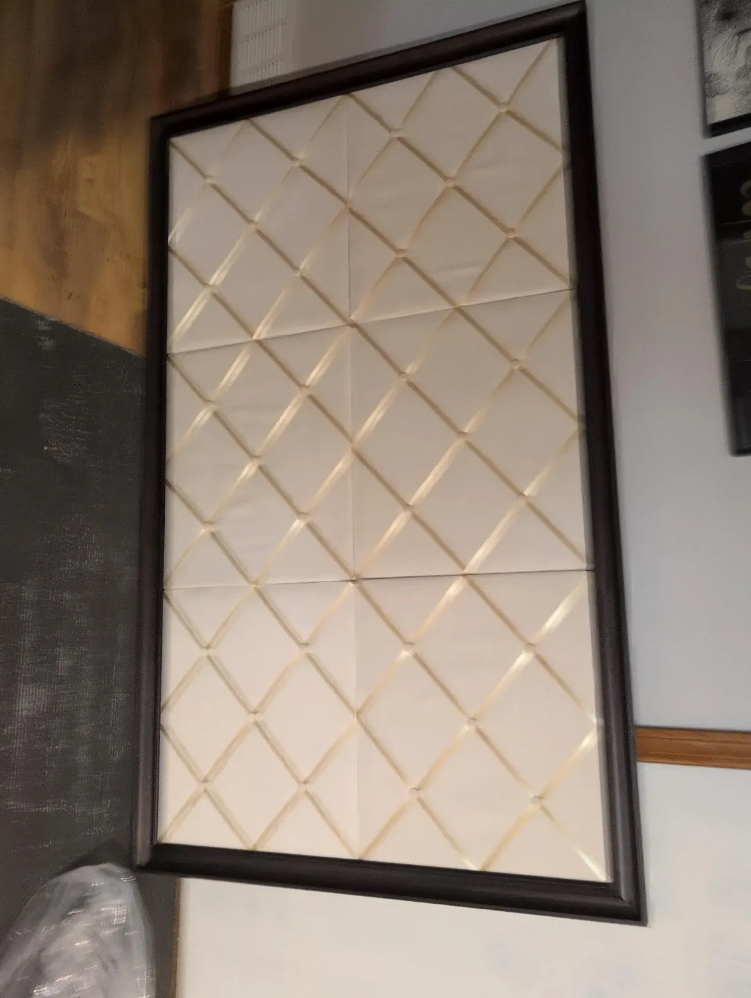 This decorative wall panel features a quilted pattern with gold ribbon accents. It's framed in dark wood. Adds a touch of elegance to any room!