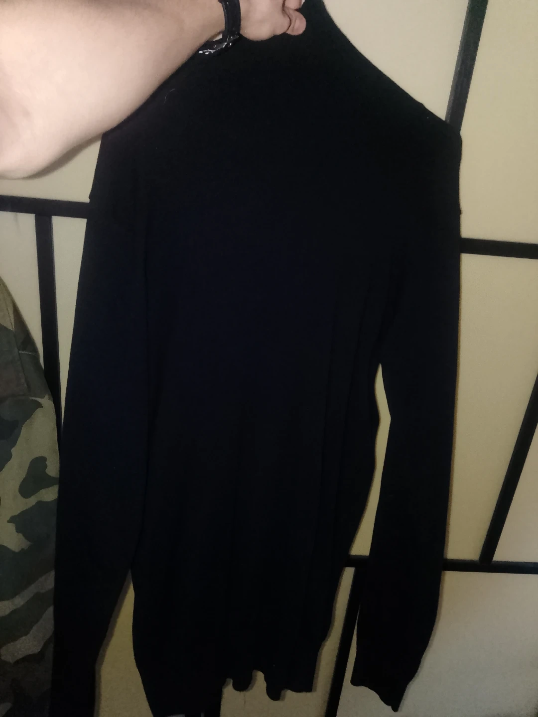 A classic black long sleeve turtleneck sweater. It's a versatile piece perfect for layering or wearing on its own. Made from a soft, comfortable material.