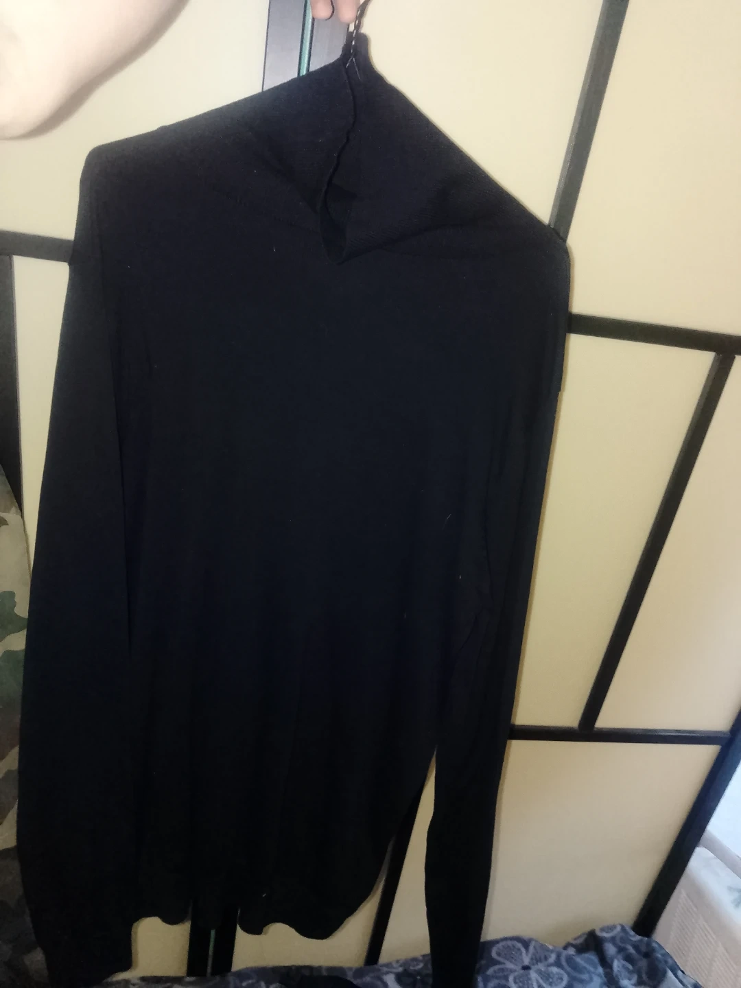 A classic black long sleeve turtleneck sweater. It's a versatile piece perfect for layering or wearing on its own. Made from a soft, comfortable material.