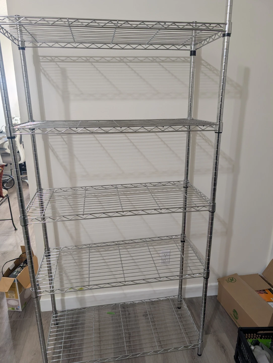 This is a five-tier wire shelving unit. It's made of durable chrome-plated steel. This unit is great for organizing storage in garages, kitchens, or workshops!