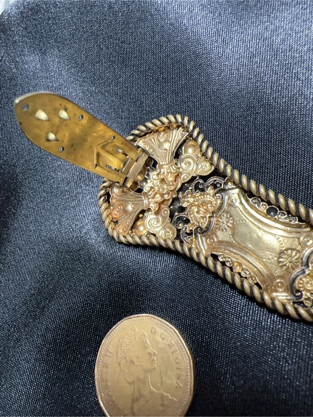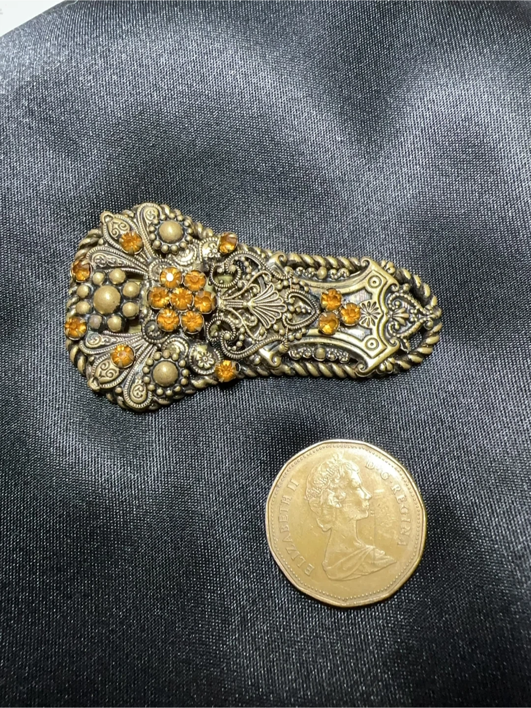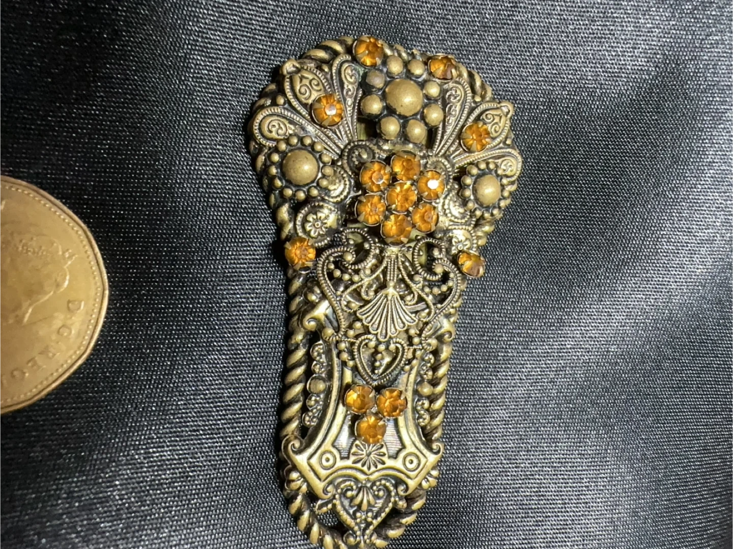 This is a beautiful vintage sash pin or brooch, possibly from the 1930s, featuring intricate filigree openwork and embellished with small, amber-coloured rhinestones. The clip features a secure clasp on the back, perfect for holding in place with an ornate, antique-style design.