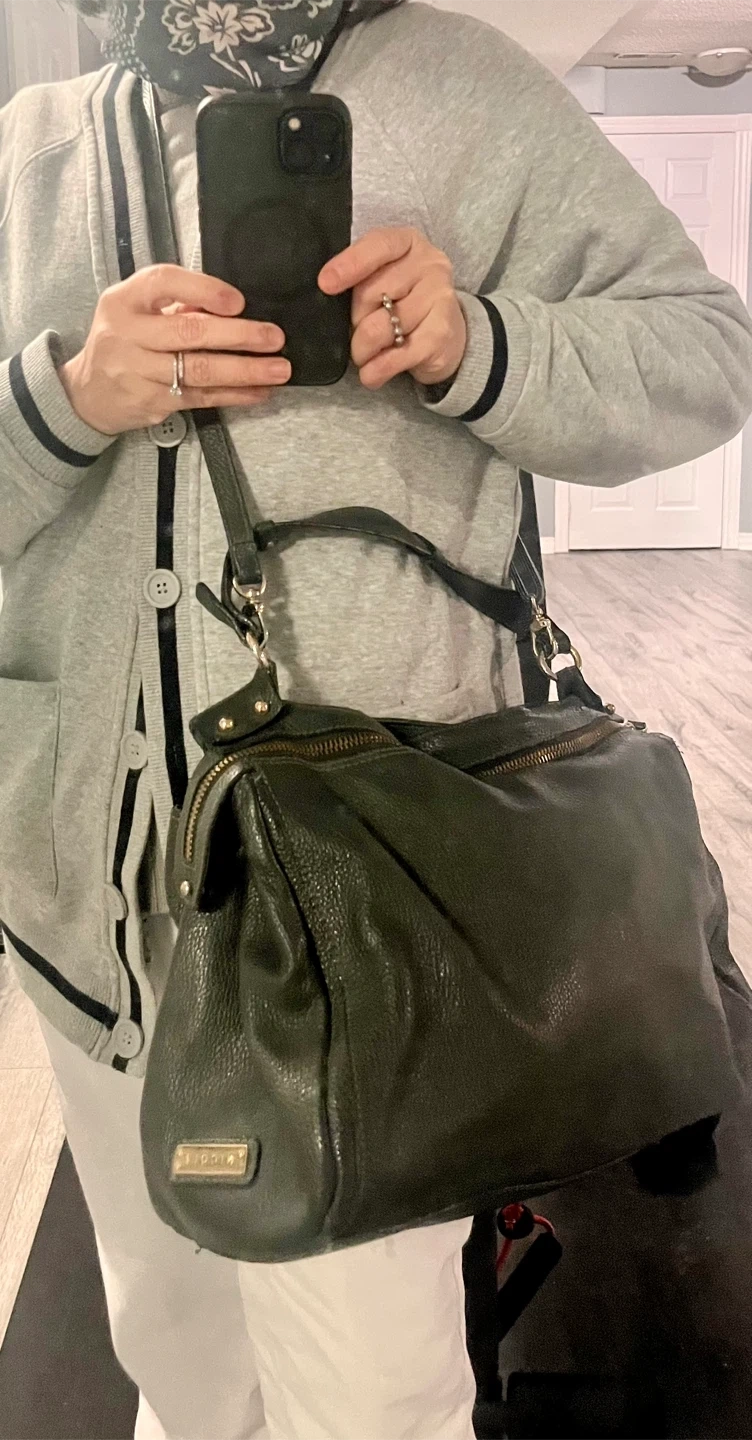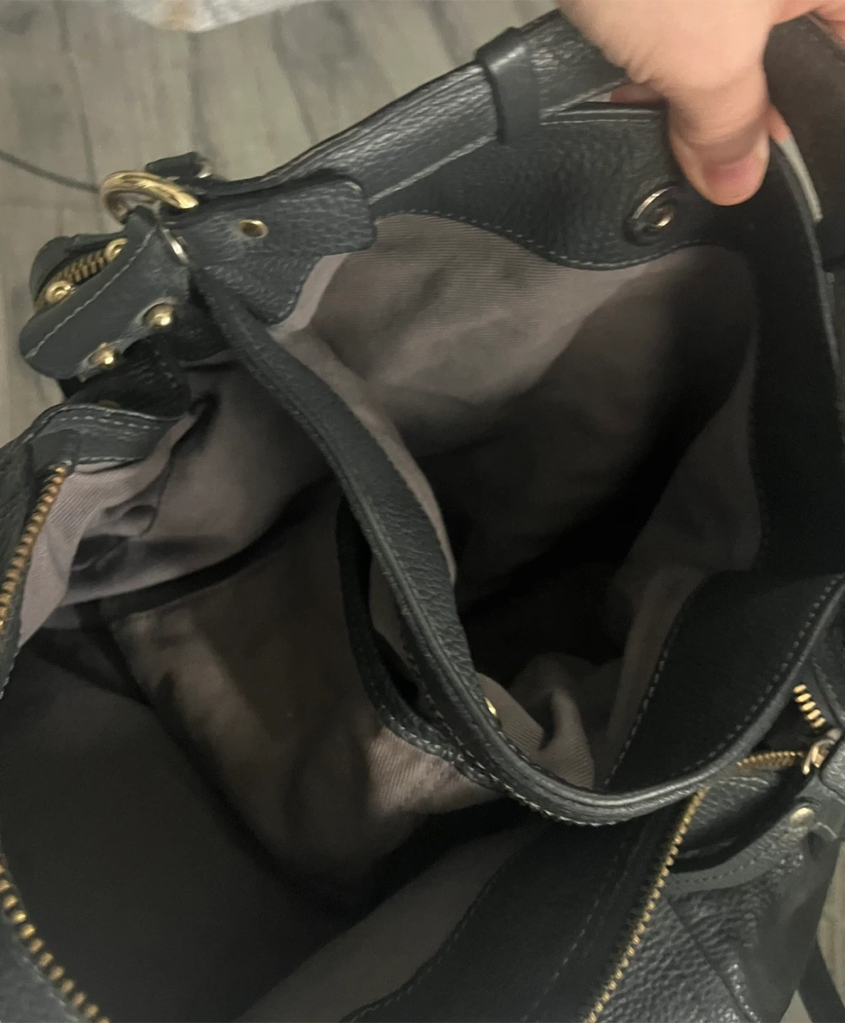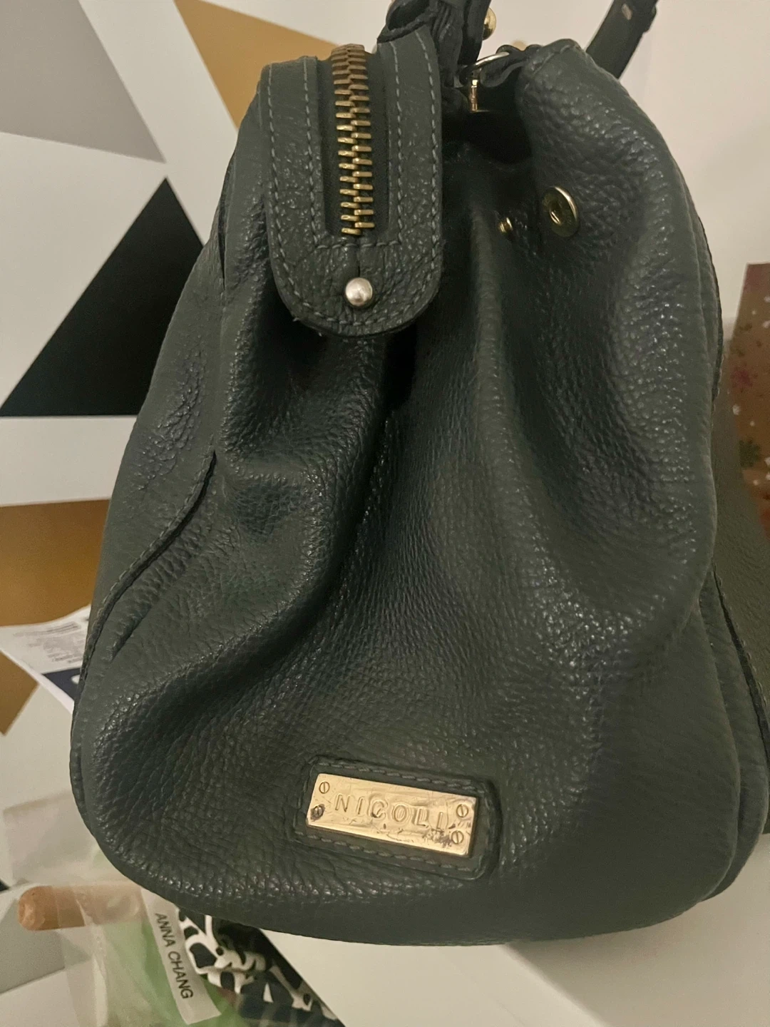 This is a NICOLI shoulder bag made from black pebbled Italian leather. It features a zip closure and multiple interior pockets. It's a versatile bag that's great for everyday use. Detachable strap into Hobo length