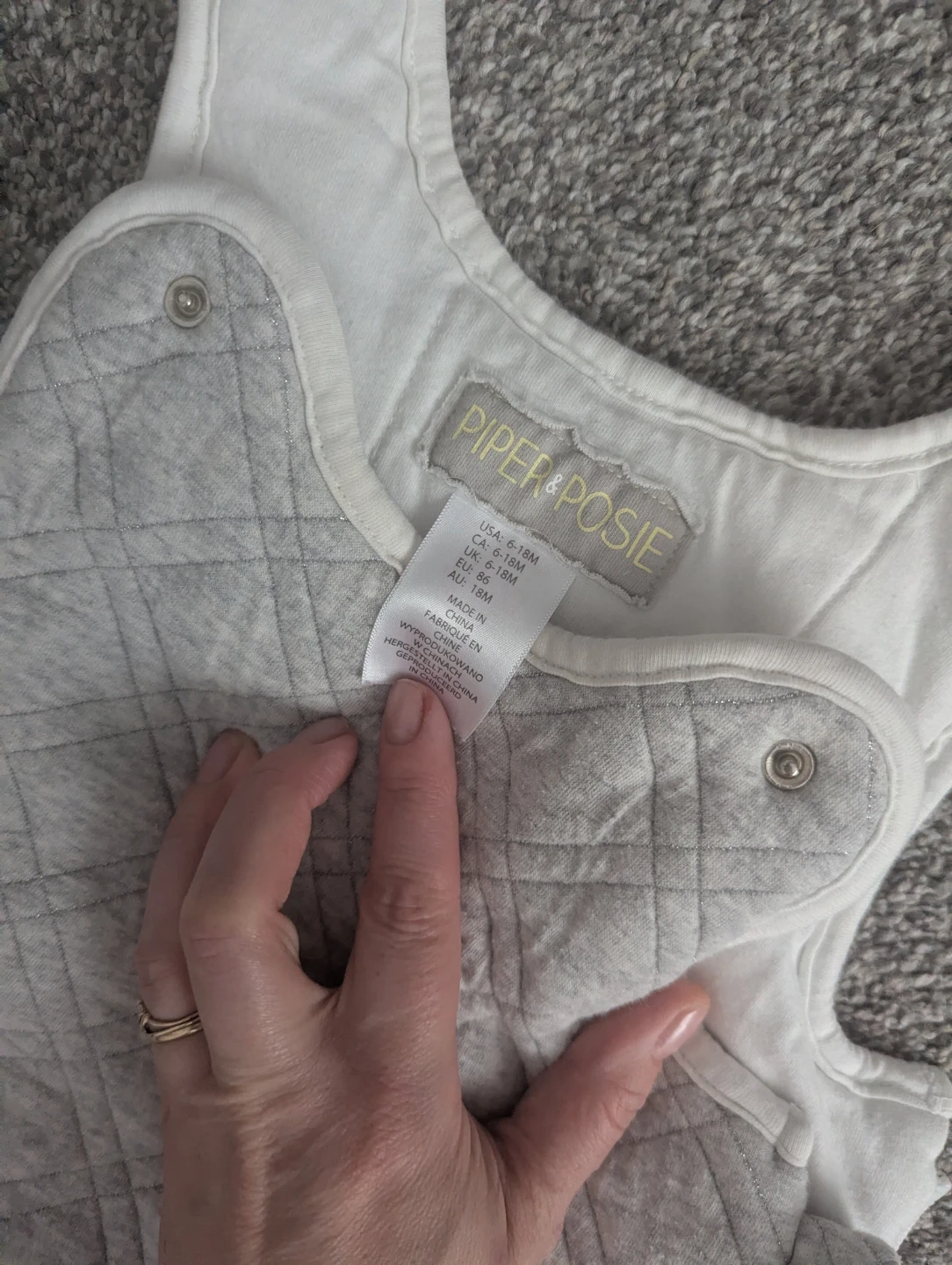 Two wearable blankets for babies aged 6-18 months. One is a Halo Sleepsack in size Small. The other is a Piper & Posie sleep sack, size 6-18M, 2.7 TOG. Shells are 33% cotton and 33% polyester with polyester fill.