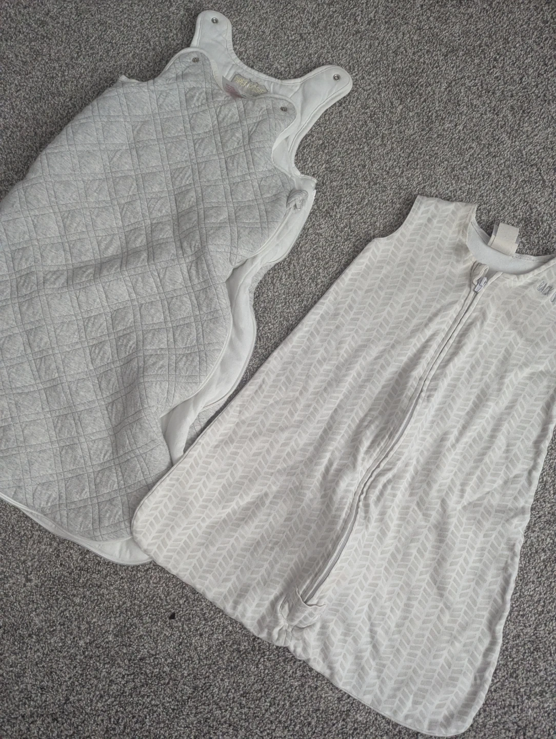 Two wearable blankets for babies aged 6-18 months. One is a Halo Sleepsack in size Small. The other is a Piper & Posie sleep sack, size 6-18M, 2.7 TOG. Shells are 33% cotton and 33% polyester with polyester fill.