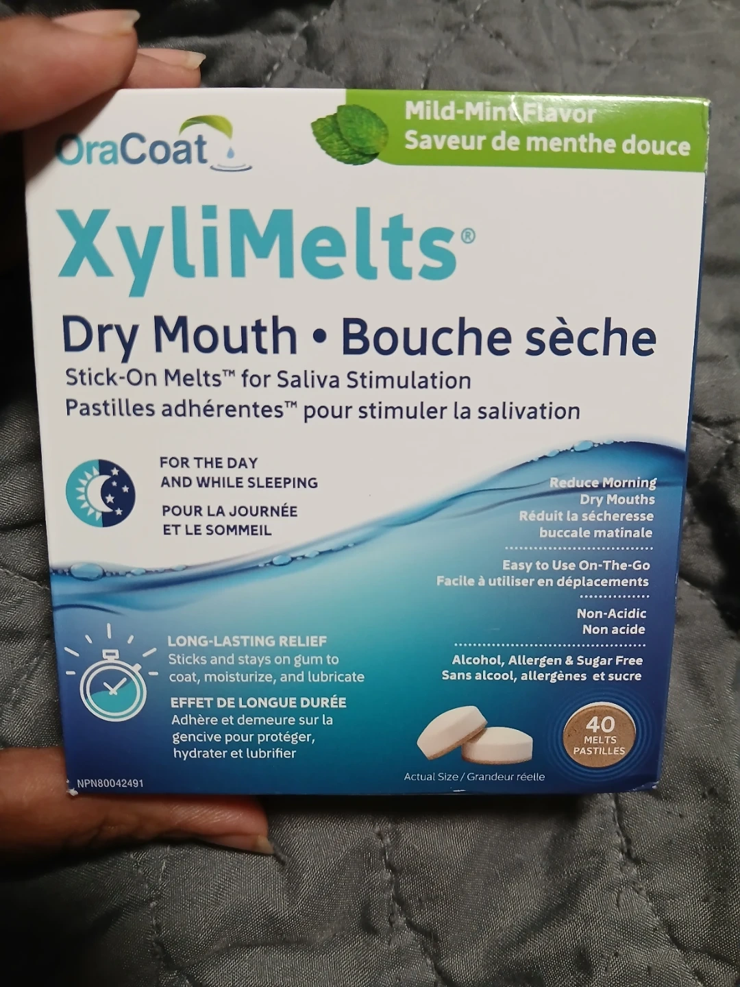 OraCoat XyliMelts are stick-on melts for saliva stimulation. They provide long-lasting relief, sticking to gums to moisturize and lubricate. This package contains 40 mild mint flavored melts, which are alcohol, allergen, and sugar-free. Use them for dry mouths during the day and while sleeping. Brand new. Expires 2028. Price is firm plz. Pick up midland and Danforth or 401 bay street or stc mall