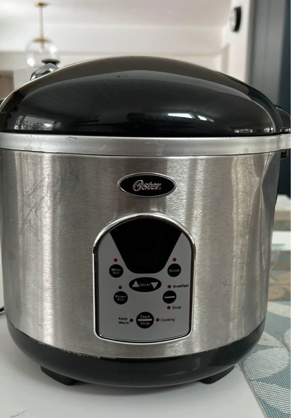This Oster rice cooker has settings for white rice, brown rice, steam, breakfast, soup, and cooking. It also has a keep warm and delay start function. It's made of stainless steel and black plastic.