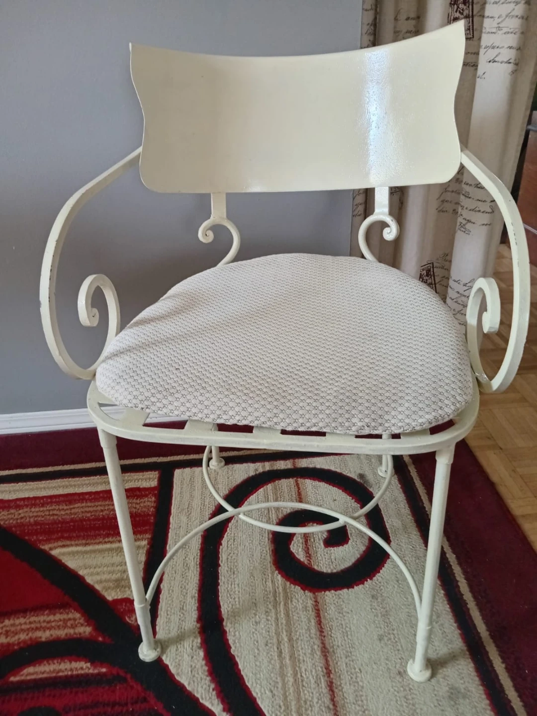 Cream metal dining set including a round glass-top table and four chairs. Chairs have padded seats. This set is suitable for garden or dining area.
