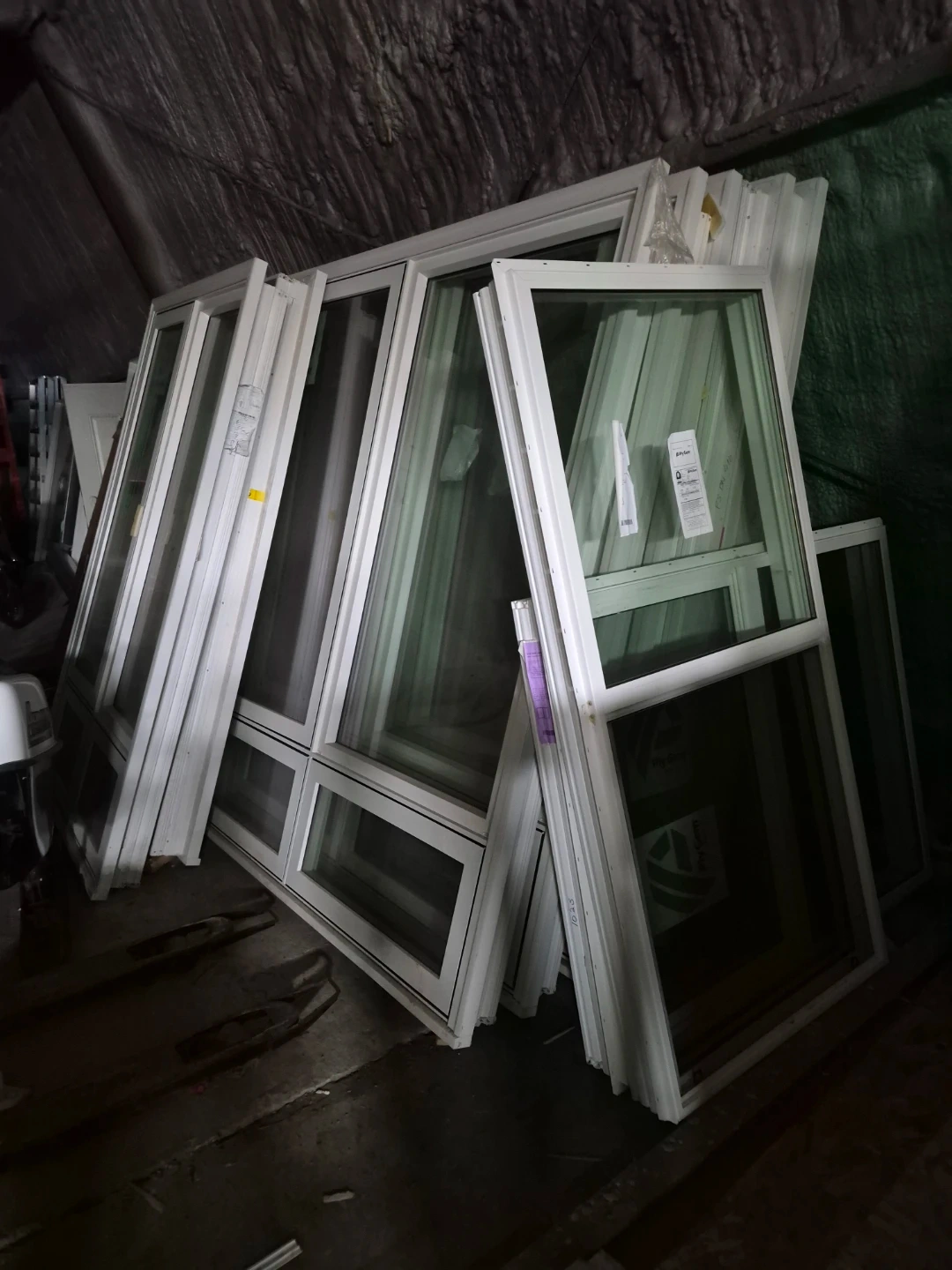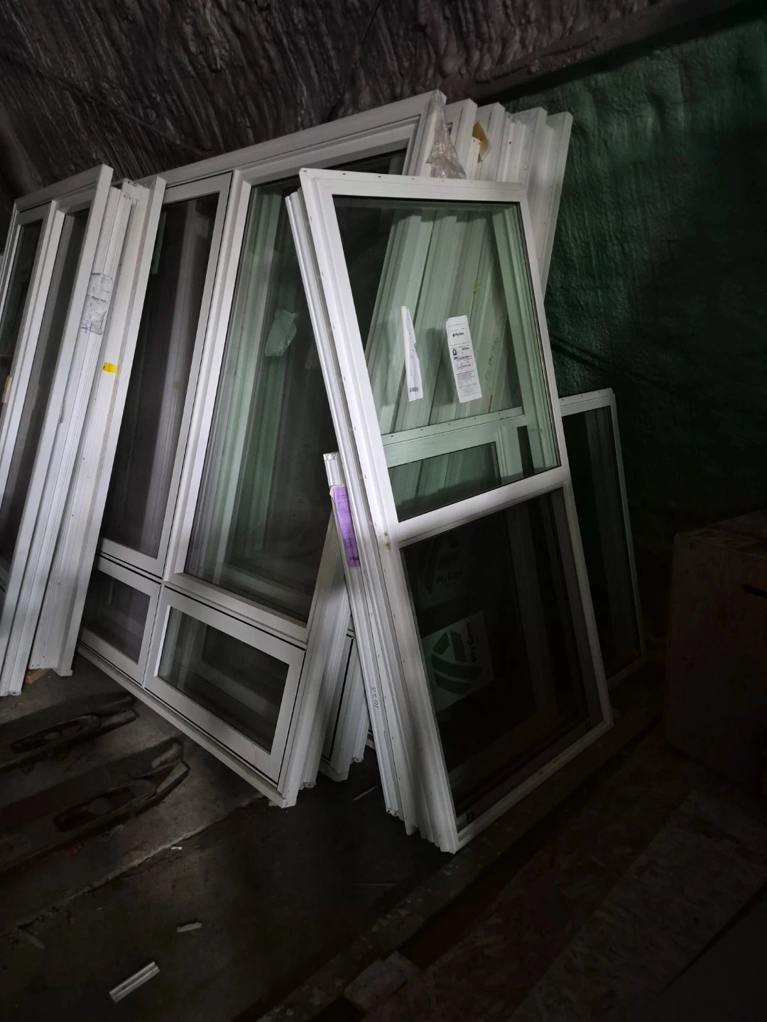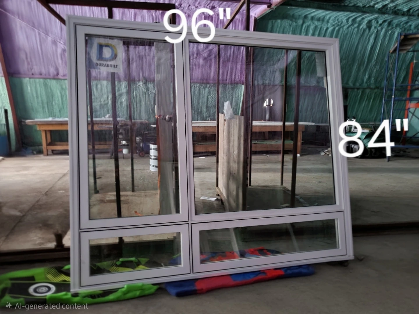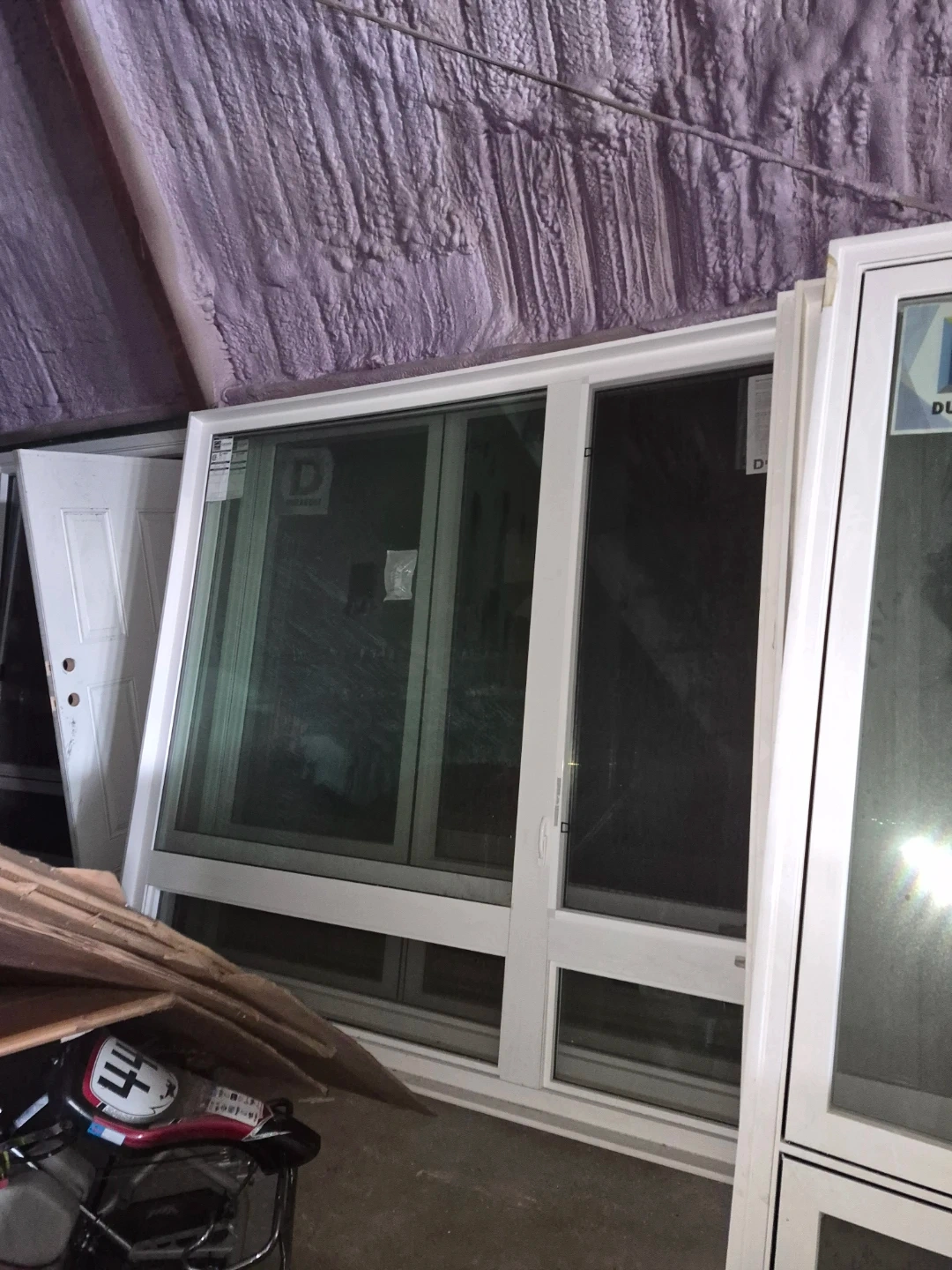 Brand new Durabuilt white vinyl windows with brick mold, available in various sizes. Dimensions include 48"x84" ($800), 72"x84" ($1200), and 96"x84" ($1500).