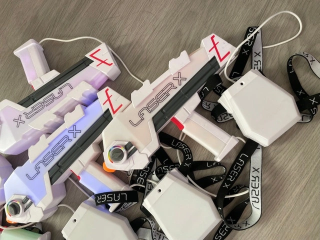 Get ready for some high-energy fun with this Laser X laser tag set! This set includes everything you need for an epic laser tag battle right in your own backyard. This Laser X set has seen a couple of battles, but is still in good condition and ready for more action. It's the perfect way to get the kids off the screens and outside enjoying some active play. Who needs a fancy arcade when you can transform your backyard into a laser tag arena? Cash accepted.