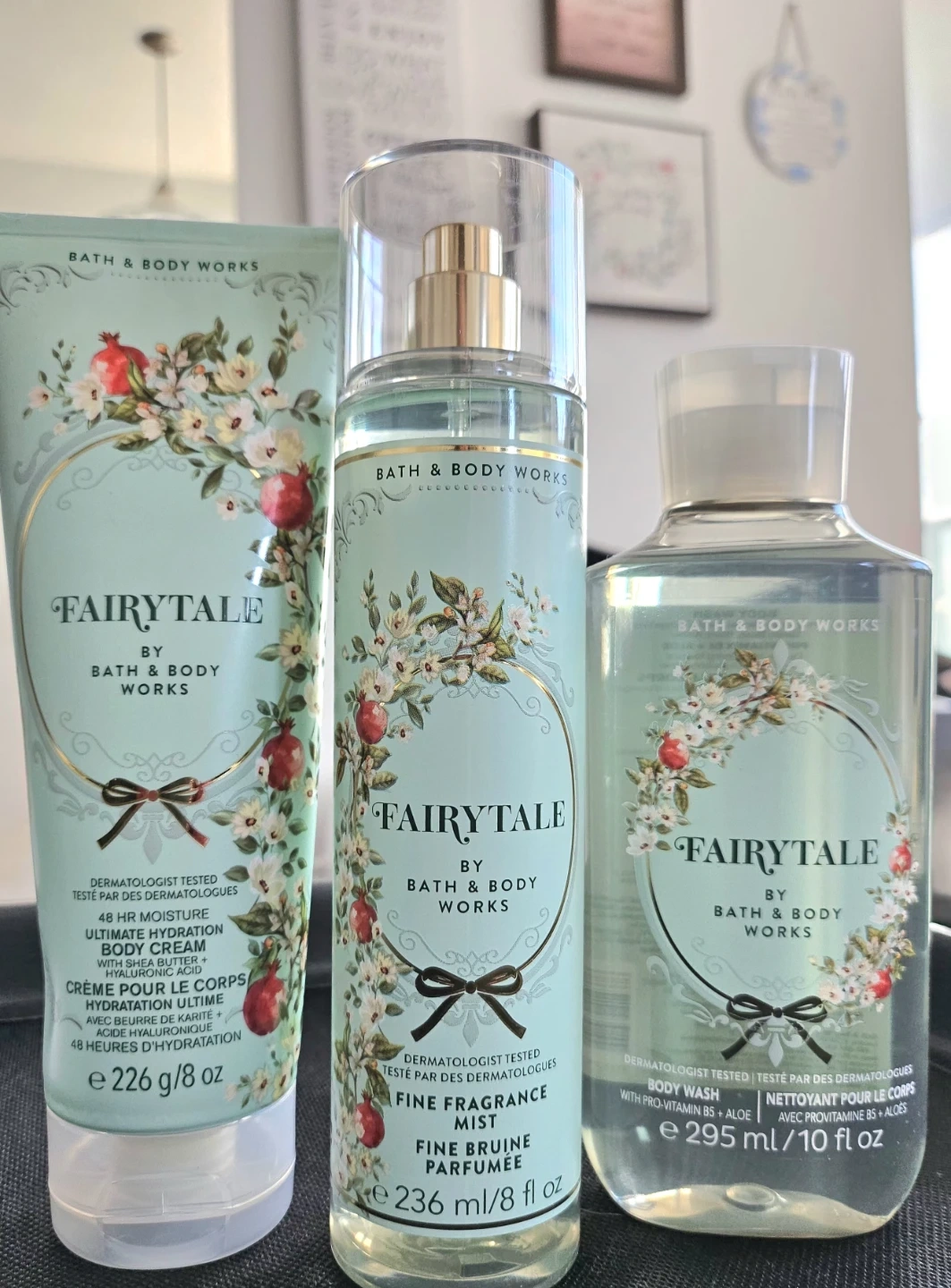 Beautiful three-piece Bath & Body Works Fairytale set. It includes a body cream, a fine fragrance mist , and a body wash. Great for gifting for Valentine’s Day, Birthdays or for self-care