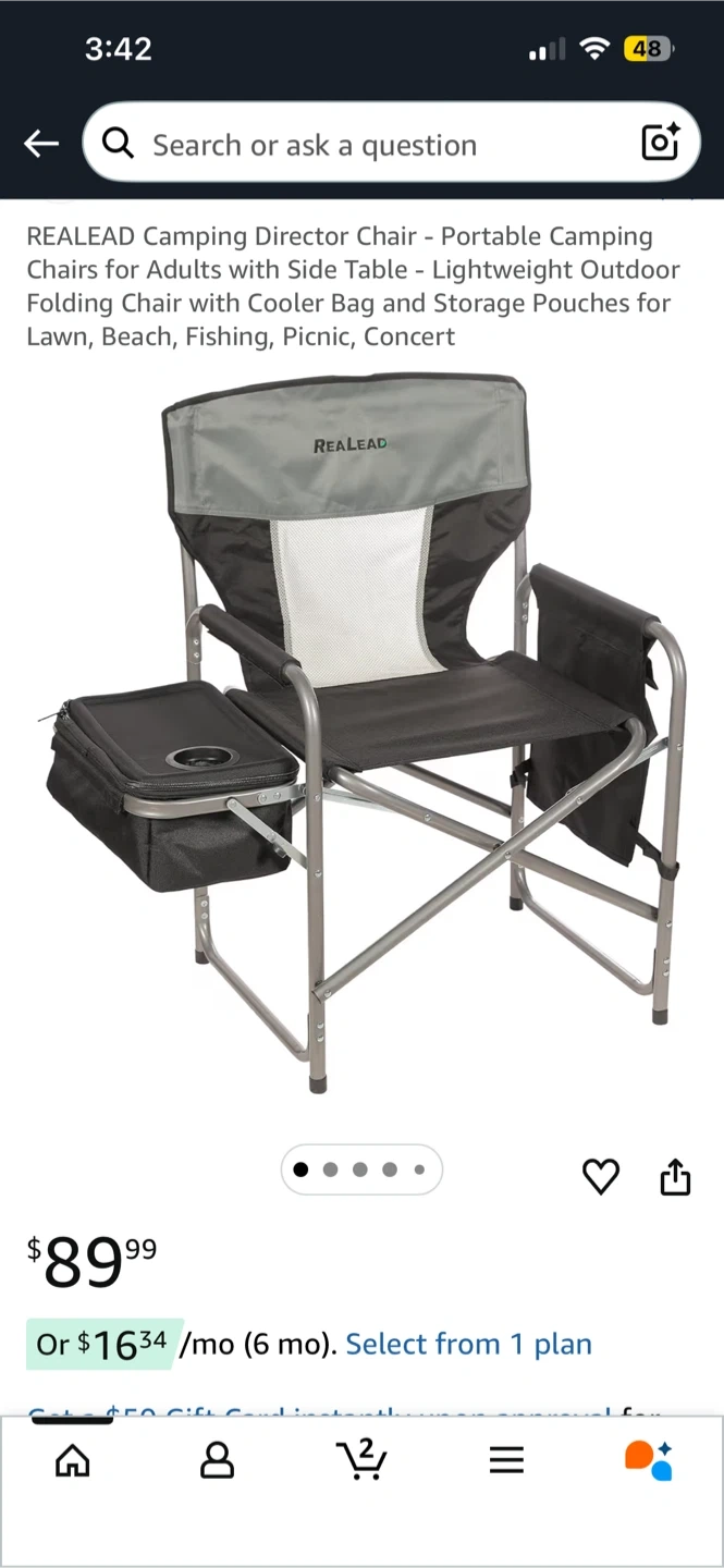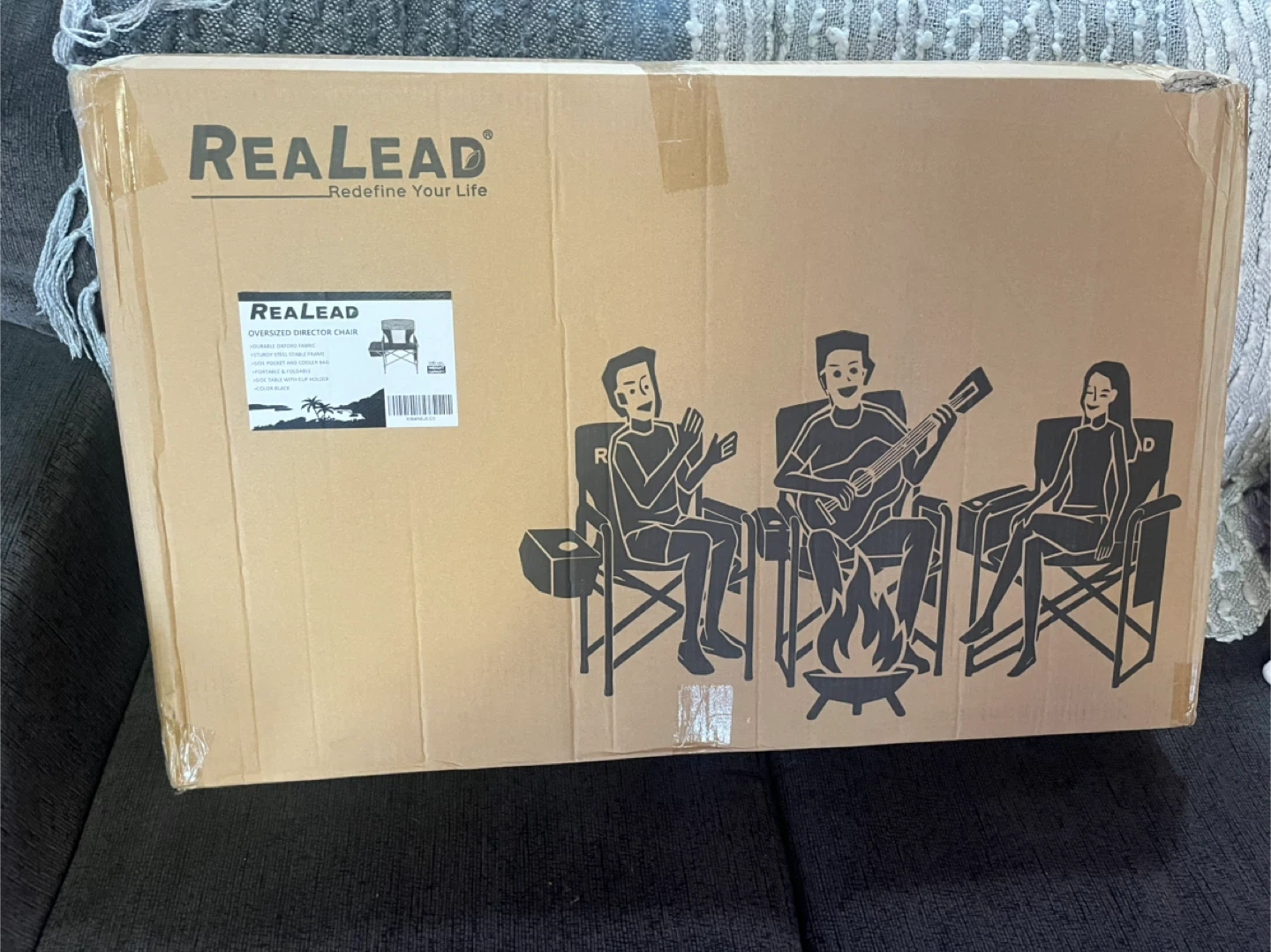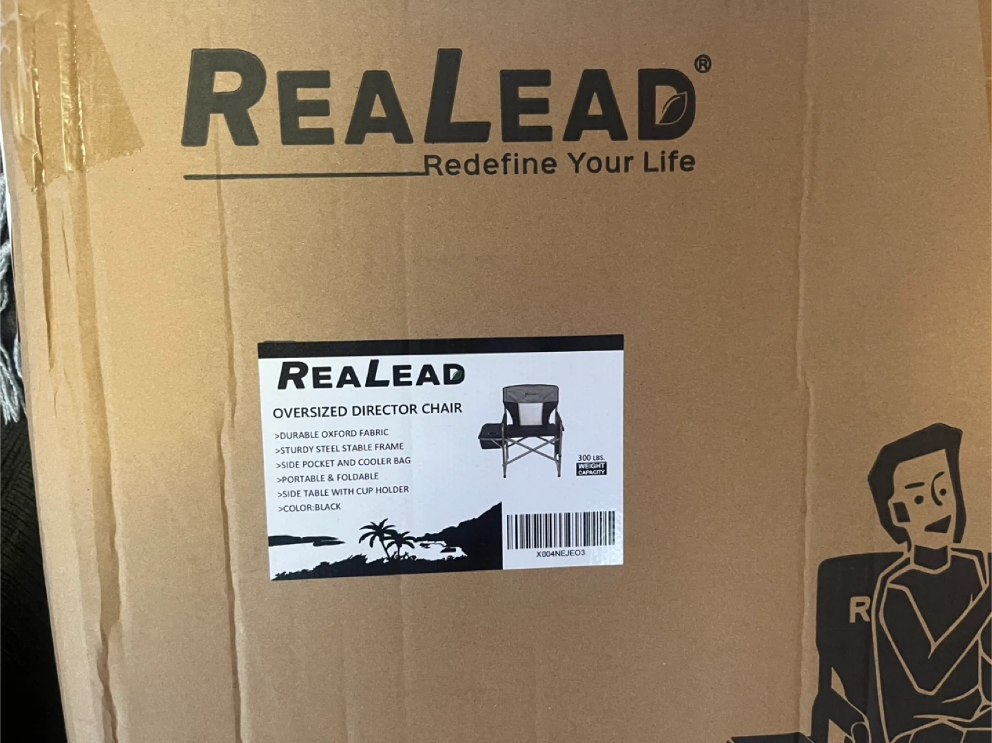 This REALLEAD Oversized Director Chair is made with durable Oxford fabric and a sturdy steel frame. It features a side pocket and cooler bag, and it's foldable. The side table includes a cup holder. This chair is black. Brand new, unopened. Perfect for fishing season, or just a chair to have guests over! ๐ asking $55 of best offer!