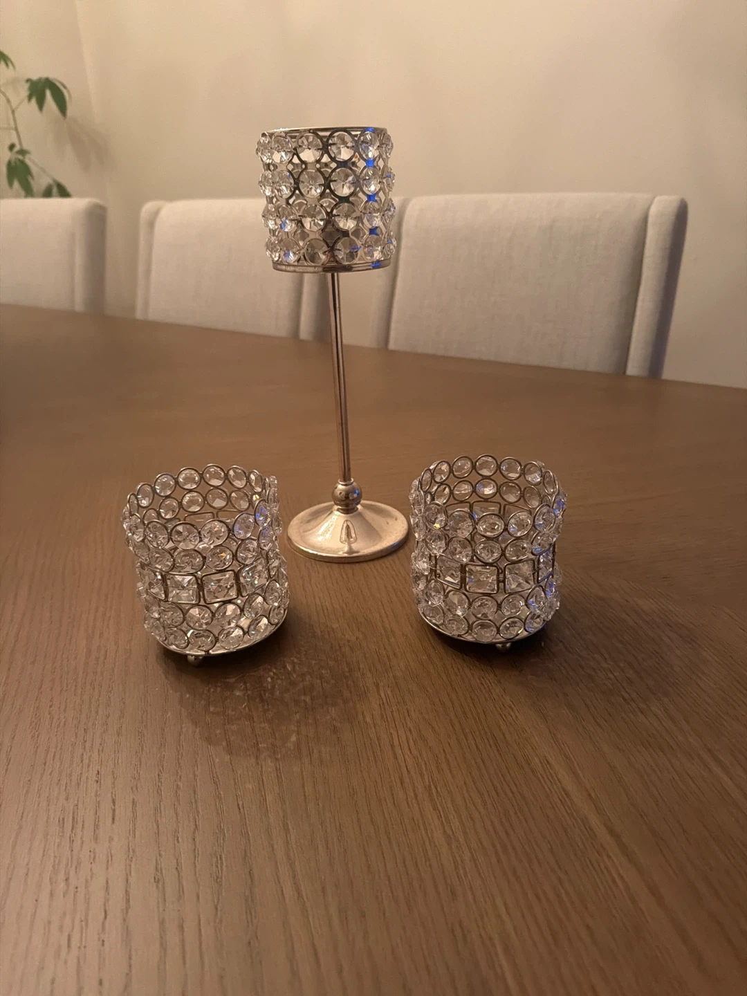 Set of three crystal candle holders. Two are short votive holders, and one is a taller stand. They're made with clear acrylic crystals on a silver-tone metal base. Adds sparkle to any table!