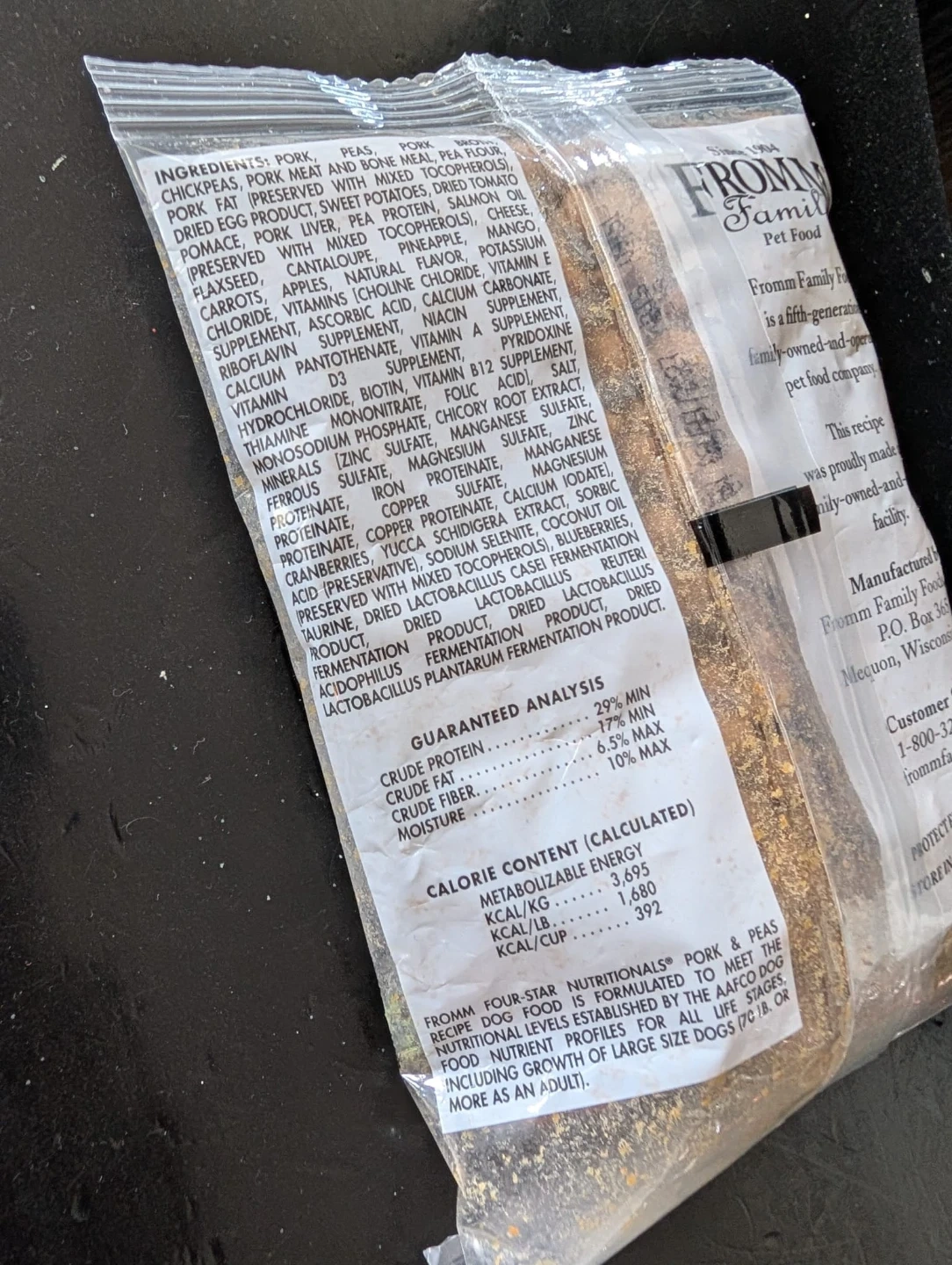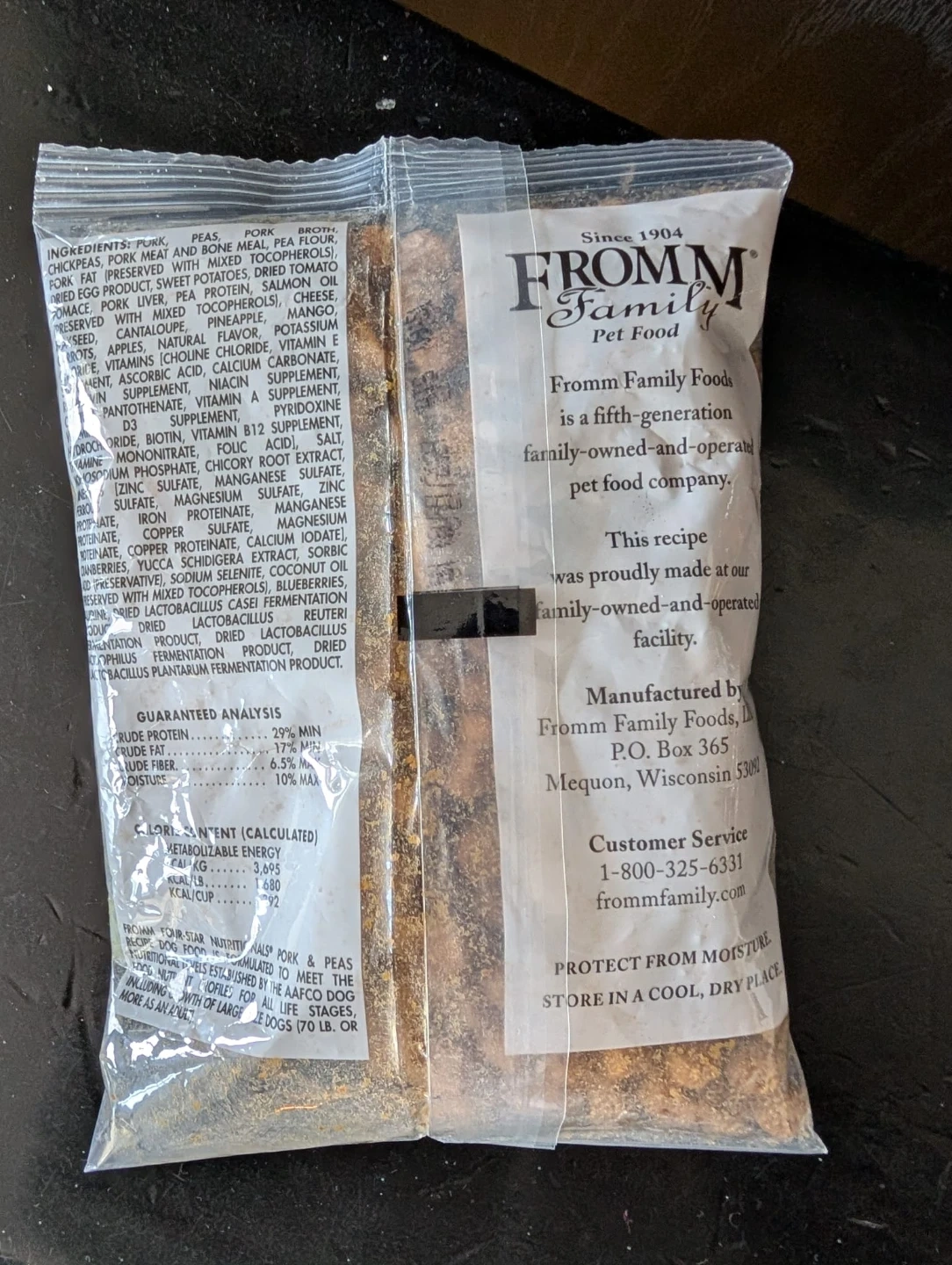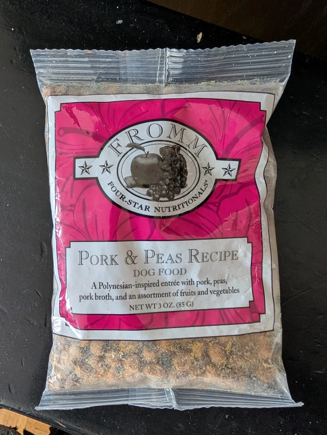 Fromm Family Pet Food Pork & Peas recipe dog food. It's a Polynesian-inspired entrée with pork, peas, pork broth, and assorted fruits and vegetables. Manufactured by Fromm Family Foods, LLC.