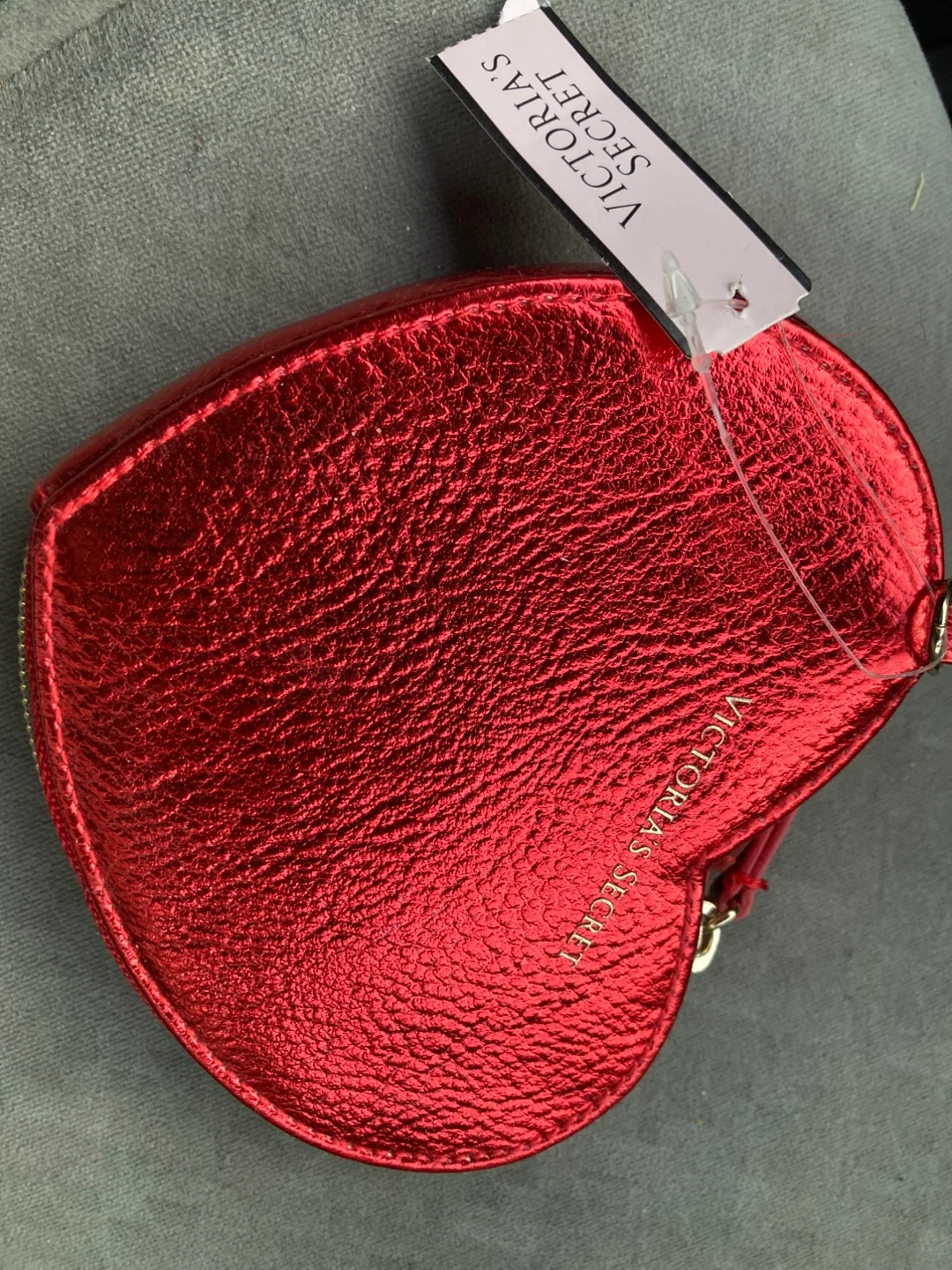 This is a bright red, heart-shaped coin purse from Victoria's Secret. It features a metallic, textured finish and a zipper closure. It's a fun accessory for holding loose change or small essentials.