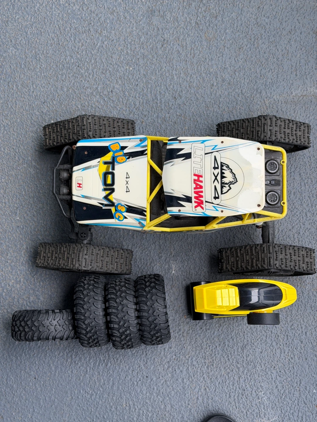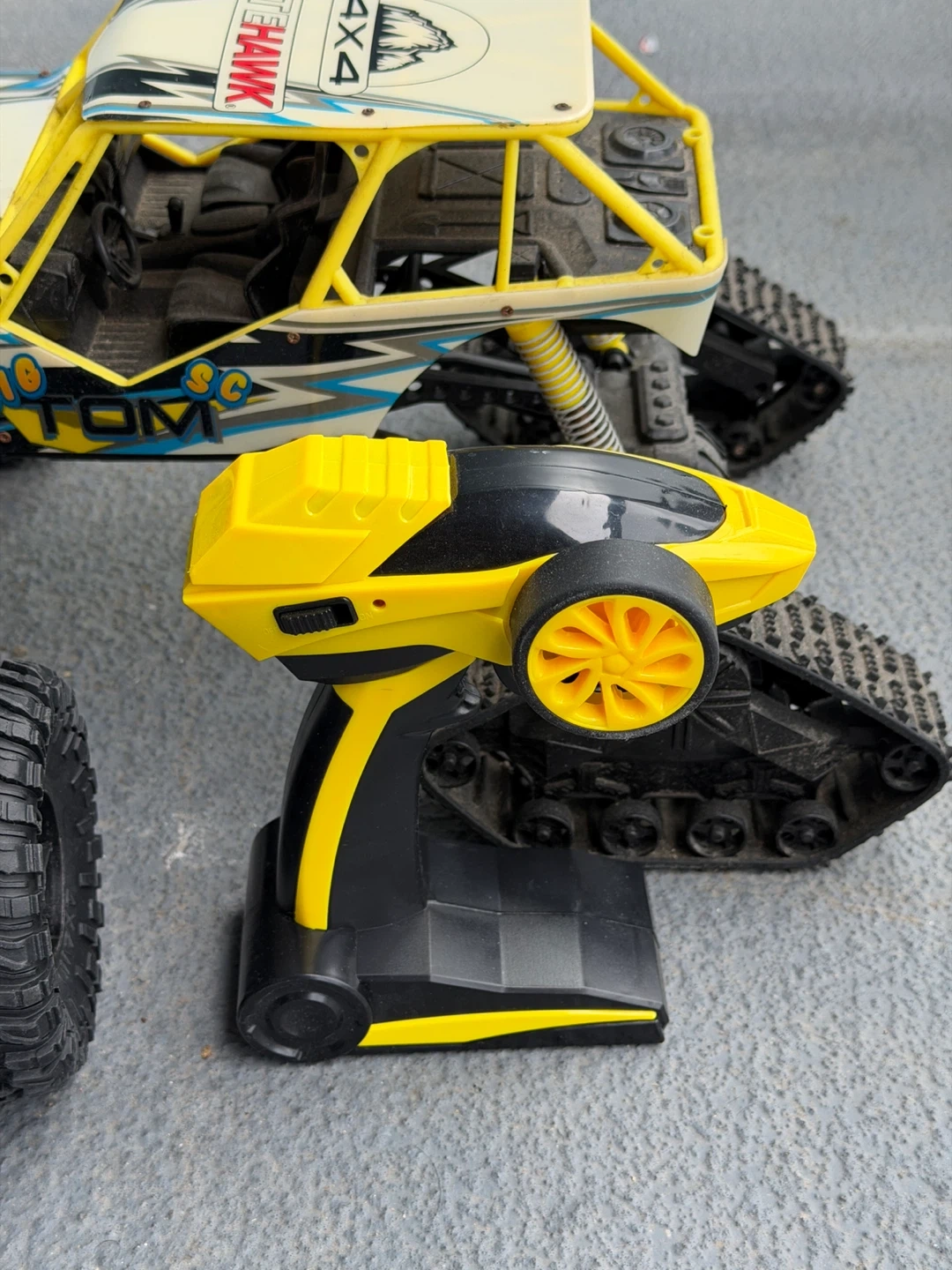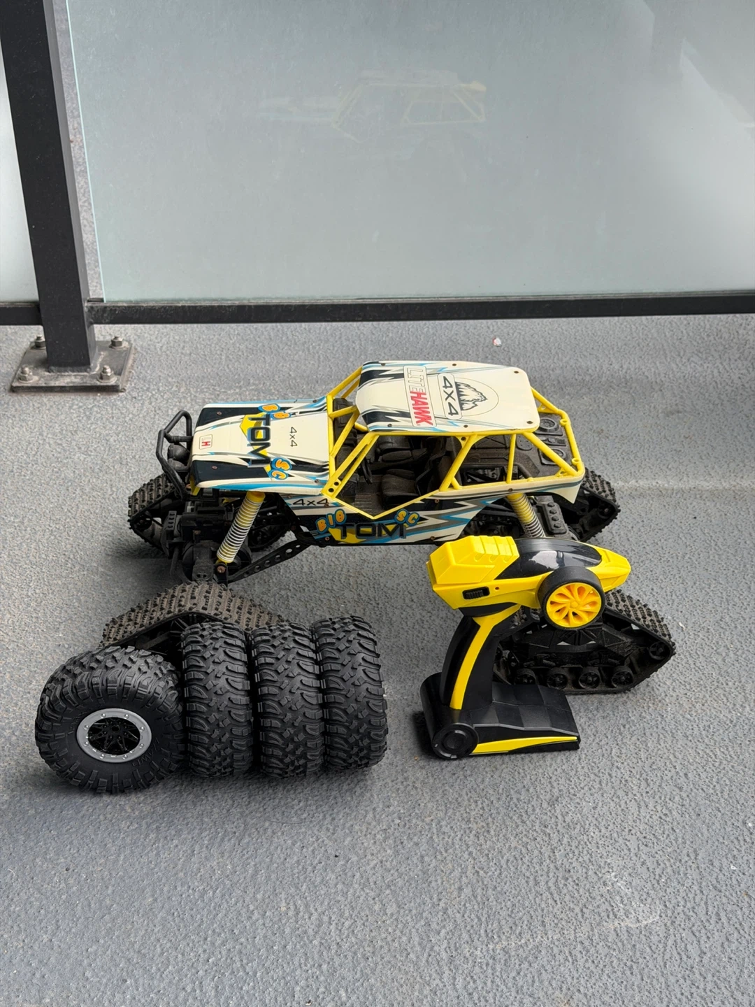 This is a 4x4 remote control rock crawler truck. It is waterproof and also runs on ice. It has extra regular tires for sand use. Amazing suspension for Jumps. Can go up to 5 km/hr. Barely used. Price is negotiable